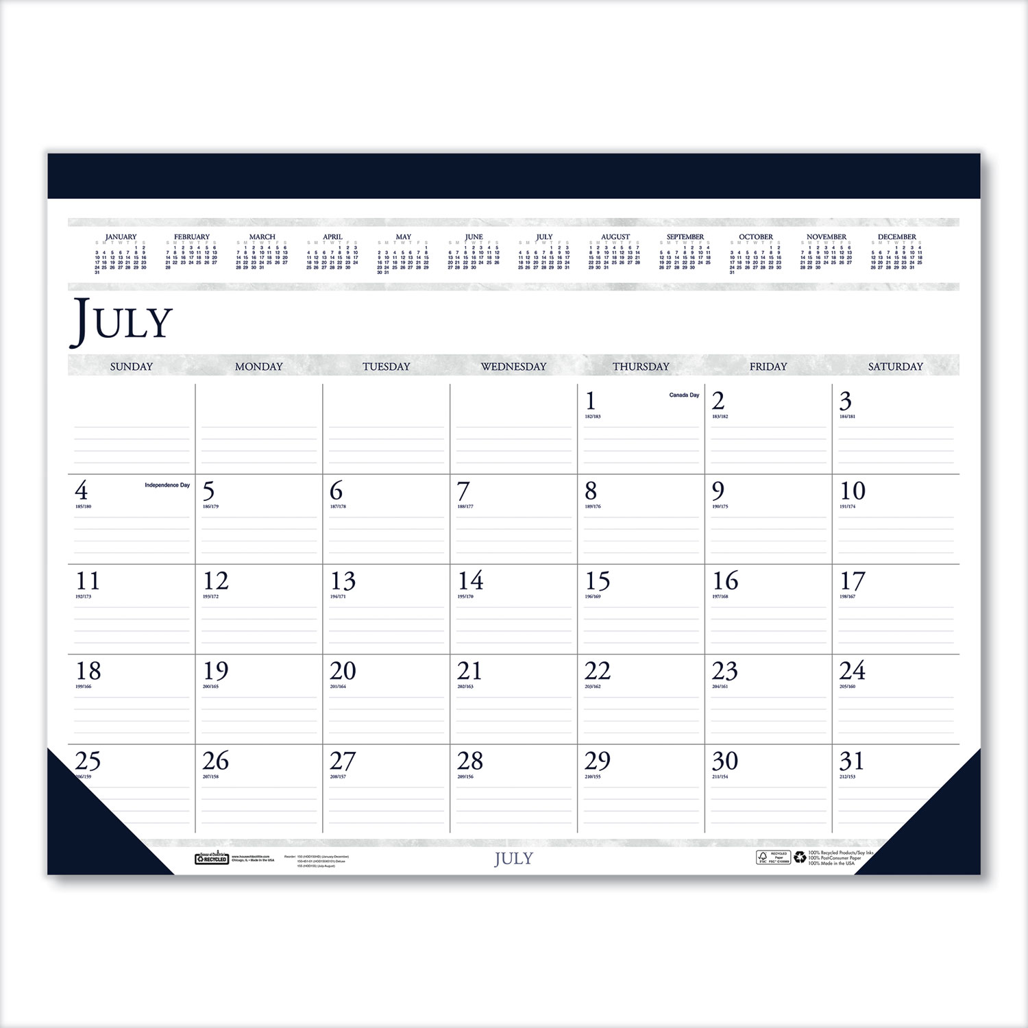 The top is bound with a blue leatherette strip that matches the pad's reinforced corners for extreme durability throughout the entire year. Each month is perforated for easy removal. Lightly ruled daily blocks help keep notations neat. Julian dates with days remaining and full-year reference calendar on each page. Made entirely of recycled materials. Size: 22 x 17; Page Color/Theme: White/Blue; Edition Year: 2020-2021; Calendar Term: 14-Month (July-Aug).