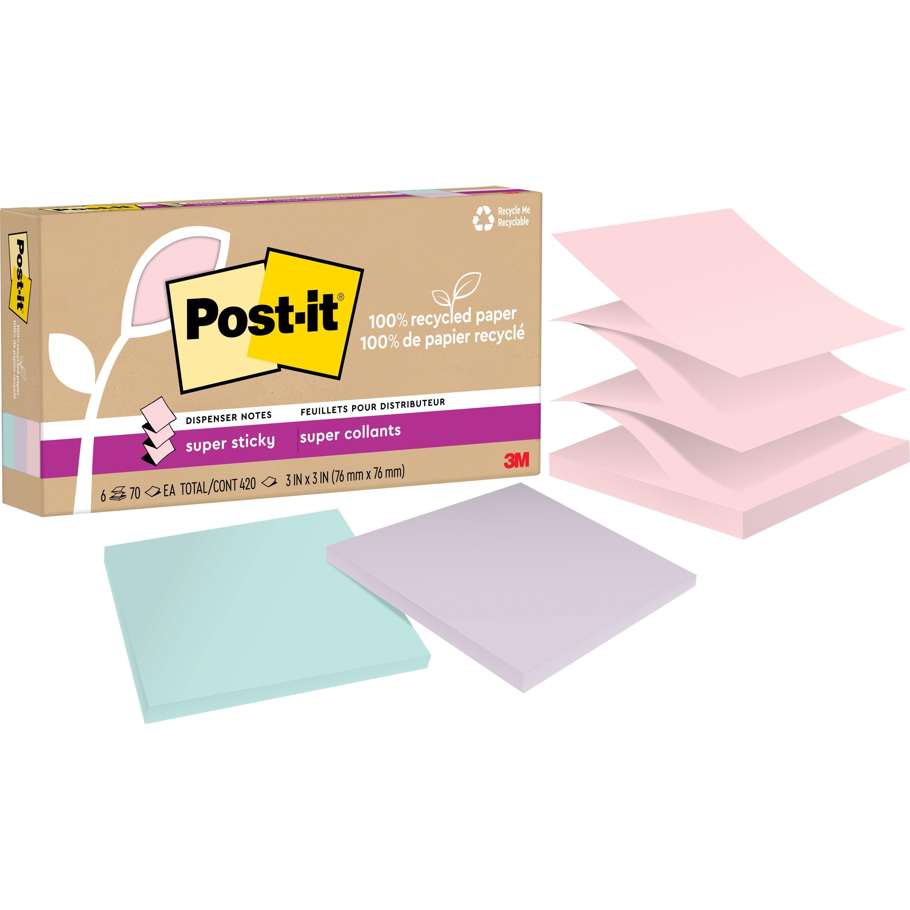 Post-it 100% Recycled Paper Super Sticky Notes are made from 100% recycled paper and feature two times the sticking power to make sure your message stays put. The water-based adhesive reliably sticks to doors, windows and walls, so you can take your to-do list anywhere. Succeed in your everyday tasks and feel good knowing these notes are made in a zero-waste-to-landfill plant. Packaging is also made from 100% recycled paper. Pad Type: Standard; Shape: Square; Color(s): Wanderlust Pastels; Color Family: Multicolor.