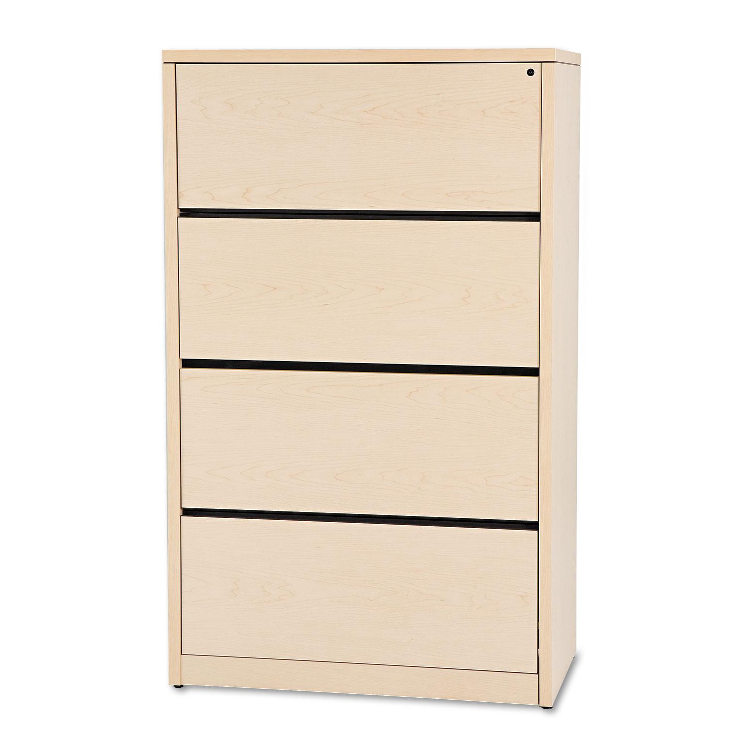 Durable, scratch-resistant laminate surfaces. Straight edges provide a clean, streamlined look. Drawers extend fully on steel ball bearing suspensions. Hang rails for letter- and legal-size hanging files. Four-Drawer. Color: Natural Maple; Color Family: Maple; Overall Width: 36"; Overall Depth: 20".