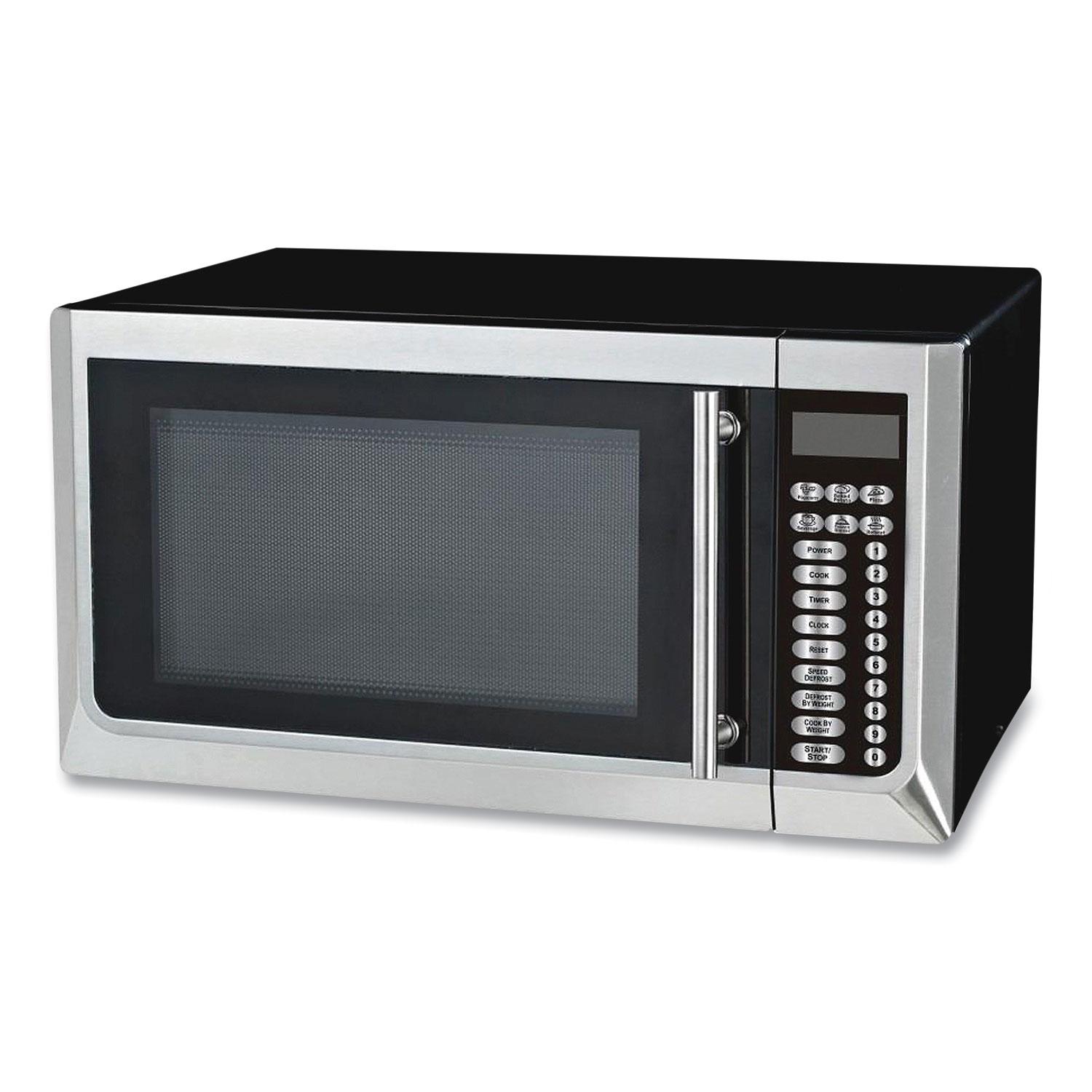 Give staff a convenient way to heat up food with this Avanti touch microwave. Six preset menu buttons offer one-touch cooking for everything from potatoes and frozen dinners to pizza and popcorn. Use the reheat option to warm up leftovers, or choose the cook by weight to prepare meats for office parties. Speed and weight defrost options make it easy to prep frozen foods before cooking. Touch-button control panel allows for effortless operation, while the spacious interior offers ample room for cooking large dishes. With its sleek design and compact size, this 1,000-watt microwave makes a handsome addition to customer-facing waiting rooms or vending areas. Ten different power levels, so you can melt butter, cook frozen foods or prepare piping hot beverages all at their optimum temperatures. Capacity (Volume): 1.6 cu ft; Color(s): Black/Stainless Steel; Width: 21.75; Depth: 20.5".