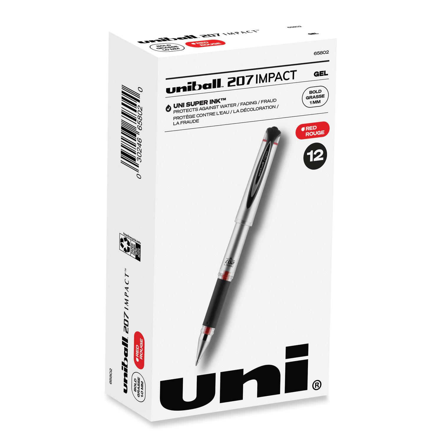 Make an impact with 207 IMPACT Gel Stick Pens from uni-ball featuring a 1.0 mm bold point with a stainless steel tip that resists bending and breaking. Even-flowing, pigment-based gel ink renders an outstanding ink laydown for a smooth writing experience and strikingly bold lines. Use these capped stick gel pens for everyday writing tasks, check signing and all of your important signatures, trusting its quick-drying uni Super Ink. Exclusive uni Super Ink technology entrenches the gel ink deep into the paper, preventing document alteration, water damage or fading. The 1.0 mm point delivers bold writing with a silky finish. A soft rubber grip helps you continue writing without fatigue while maintaining precision and detail throughout your tasks. Lend a vivid touch to your writing with these sophisticated gel stick pens that glide smoothly for distinct and neat writing. Pen Sub-Brand & SKU Line: 207 Impact; Pen Style: Stick; Pen Type: Gel Pen; Refillable (Yes/No): No.