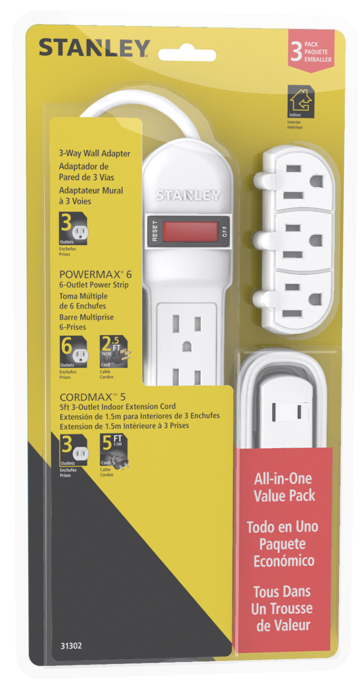 3pc Value pack Contains: 6-Outlet Power Strip(2.5ft Cord), 5ft 3-Outlet Indoor Extension Cord (SPT-2) & 3-Outlet Wall Adapter