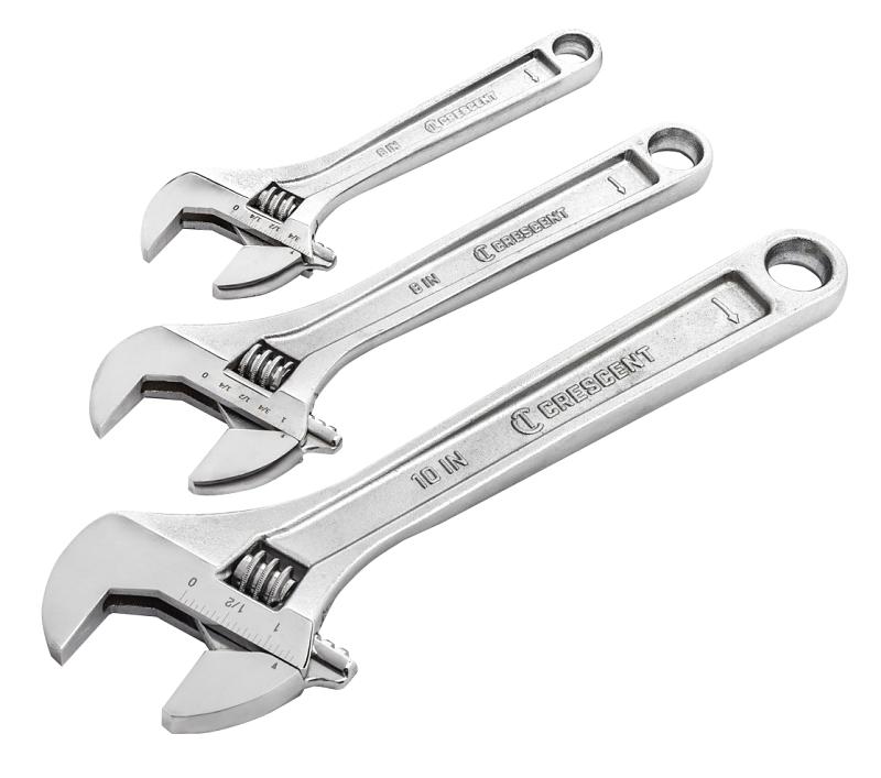 Crescent 6 in., 8 in., and 10 in. Adjustable Wrenches all feature a large knurl for easy adjustment and a tight jaw fit. Their hex jaw design helps reduce slippage and tightly grips the fastener for solid, secure operation, while the corrosion-resistant chrome finish helps prevent rusting. A wide handle design provides comfort and reduces fatigue during extended use, ideal for both pros and do-it-yourself enthusiasts.