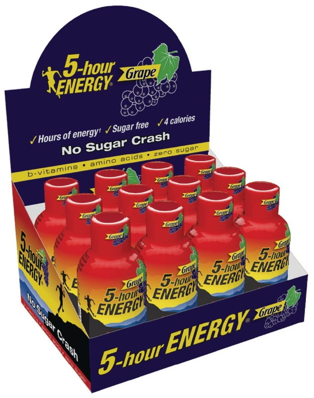 Looking for the ideal pick-me-up, pick up a grape 5-hour ENERGY shot. It fixes tired fast with its famous blend of vitamins, nutrients and caffeine. All with zero sugar and four calories. So start your day alert and energized with a Grape 5-hour ENERGY shot.