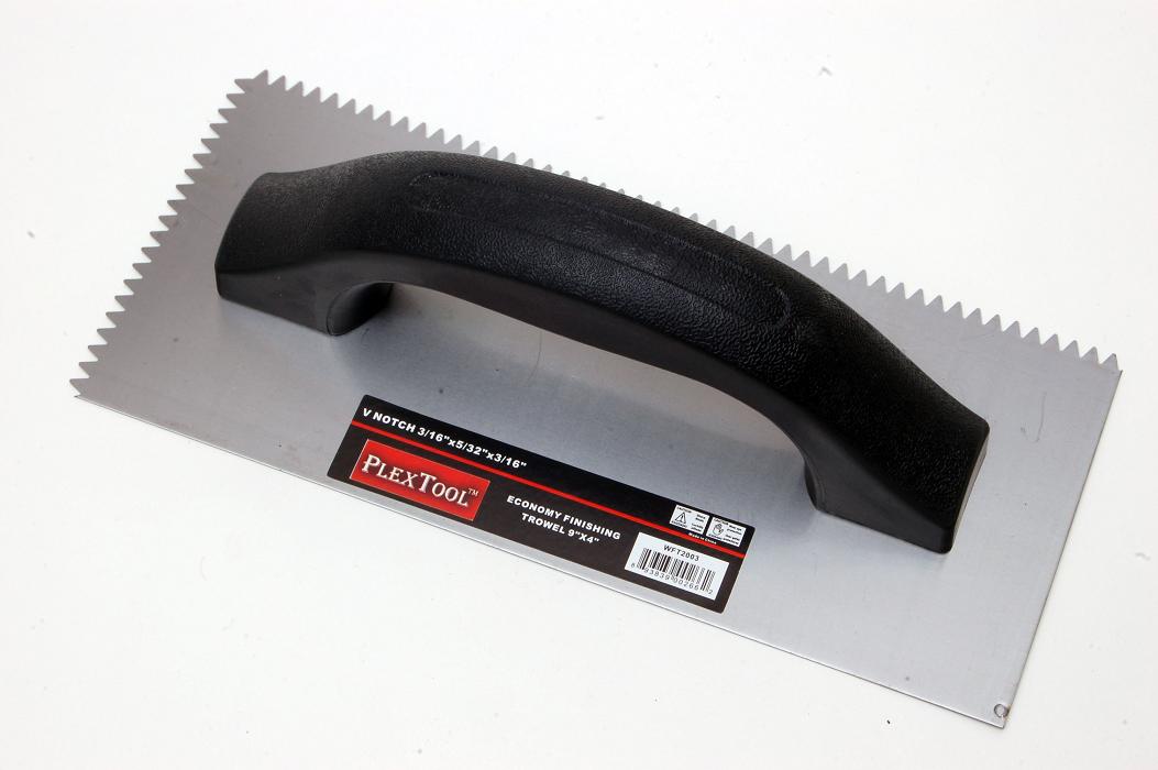 A finishing trowel is a tool used to smooth mortar or plaster. The tool has a very flat blade to which a curved handle is attached. This blade is normally rectangular with very pointed corners and edges that are somewhat sharp. It is used by placing the blade firmly against the surface to be smoothed, then moving the trowel in a straight line.