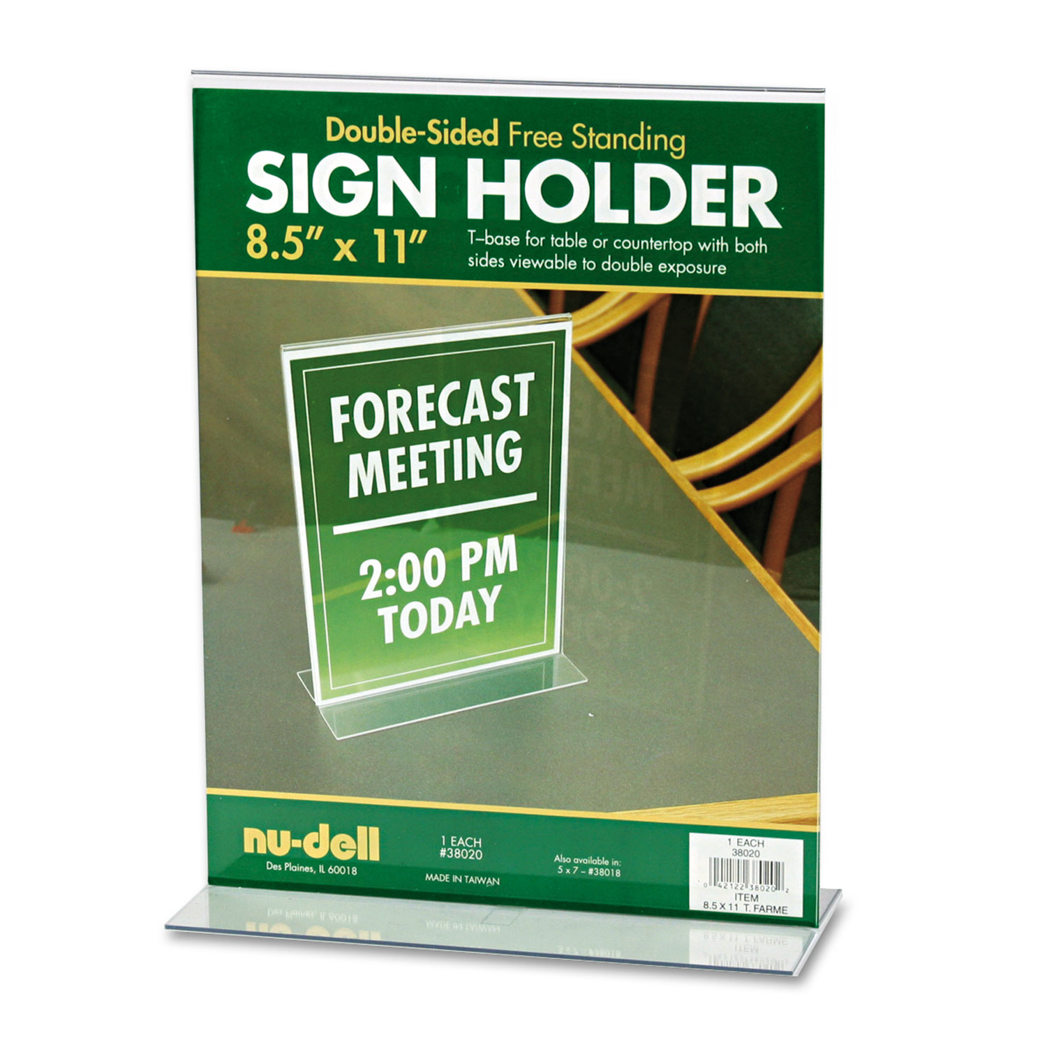 Sign, photo or certificate slides in easily. Crystal clear choice in sign display. T-Frame Base. Frame Color: Clear; Size: 8 1/2 x 11; Insert Size: 8 1/2 x 11; Material(s): Acrylic.