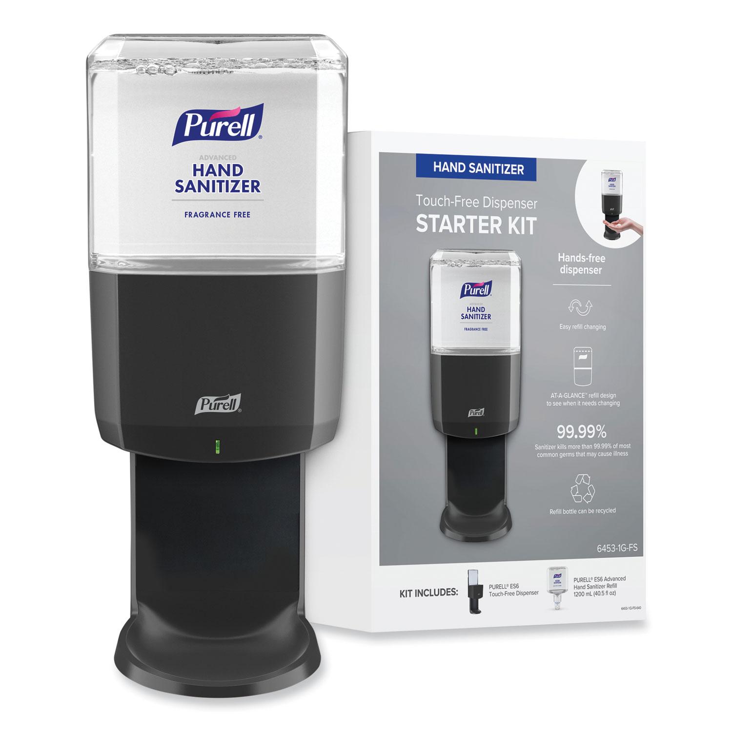 Provide hand hygiene when and where it's needed with the PURELL ES6 Touch-Free Hand Sanitizer DispenserStarter Kit. Kit includes ES6 dispenser and one refill. Place by entrances, outside restrooms, in breakrooms, and in other areas of the facility to send a signal that your building is committed to health. Plus, research shows that 80 percent of people said seeing PURELL products left them with a positive overall impression. Includes 1200 mL refill of PURELL Advanced Hand Sanitizer, which kills 99.99% of most common germs and leaves skin feeling clean and refreshed. Large size minimizes change outs. Mounting: Wall; Holds: 1,200 mL; Color(s): Graphite; For Use With: PURELL ES6 Dispenser Refills.