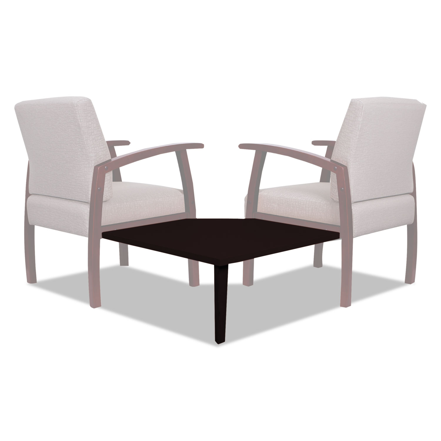 Stylish wood ganging tables designed to seamlessly attach with coordinating guest chairs. Create coffee tables between chairs or corner configurations to fit any space. Reinforced brackets with multiple connection points for a solid tabletop. Durable woodgrain laminate is water-, scratch-, and dent-resistant. Corner Table. Top Color: Mahogany; Color Family: Mahogany; Top Shape: Corner Wedge; Top Thickness: 3/4".