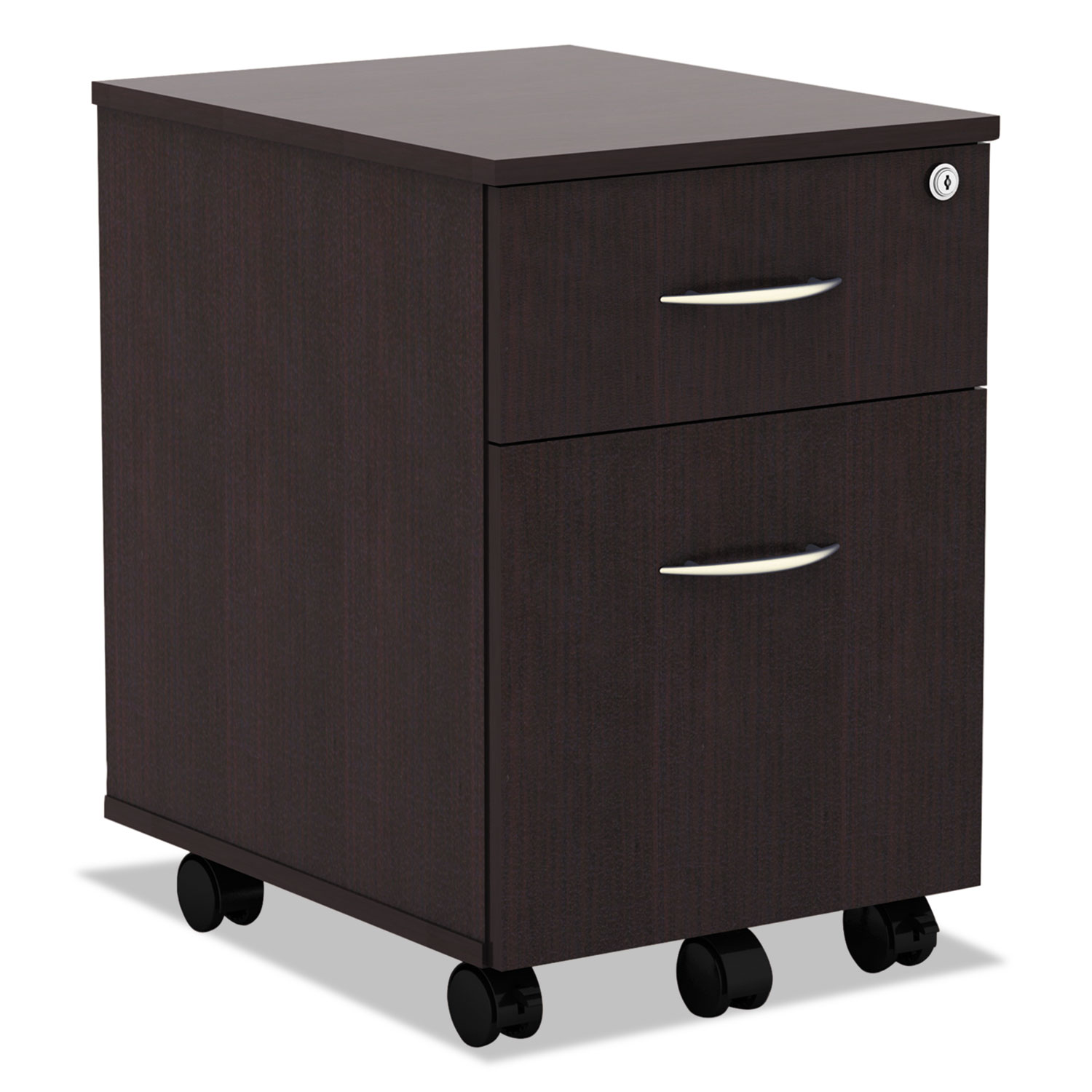 Sturdy woodgrain laminate mobile box file pedestal to store all your office necessities. Full-extension ball bearing slides on file drawer for easy access. Durable laminate is water-, scratch-, and dent-resistant with 3 mm protective edge banding. Two fold-away safety keys included. Accepts Alera Pedestal Cushions for an instant seating option. Box/File. Color: Espresso; Color Family: Brown; Overall Width: 15.88"; Overall Depth: 19.13".