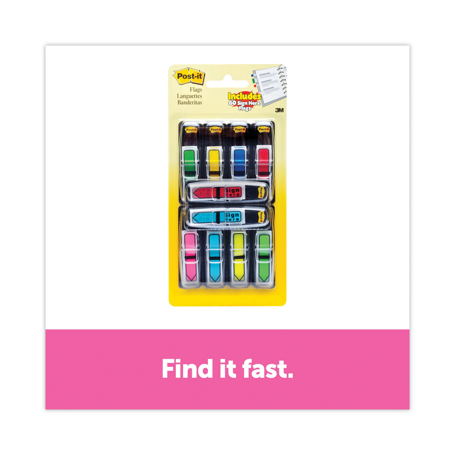 Post-it 1/2" Wide Arrow Flags allow you to point precisely to what's important on the page. They stick securely and can be removed without damaging your documents. Each pack comes in a convenient, detachable pop-up flag dispenser that can be used alone or in a 3M Desk Organizer or larger Post-it Flag Dispenser. Value PackStock up and save! Color(s): Assorted Primary; Assorted Brights; Color Family: Multicolor; Message(s): Blank; SIGN HERE; Dispenser: Pop-Up.