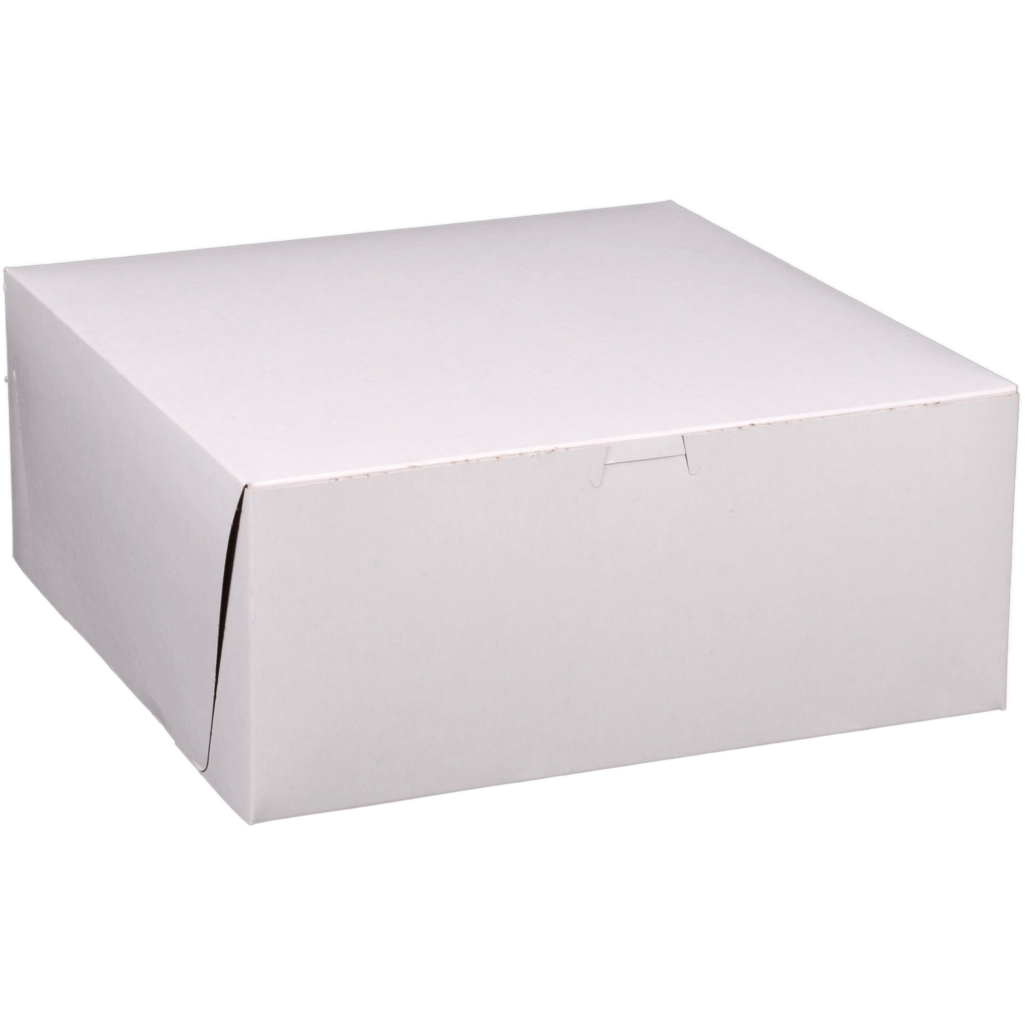 Traditional bakery boxes with locking corners ensure that your cookies and cakes arrive at their destination safe and sound. A tuck-in top creates a secure closure, protecting your baked goods. Convenient one-piece construction makes boxes easy to assemble. Sturdy paperboard bakery boxes provide an attractive presentation at an economical price. Standard. Food Container Type: Box; Material(s): Clay-Coated Paperboard; Food Container Material Type: Paper; Color(s): White.