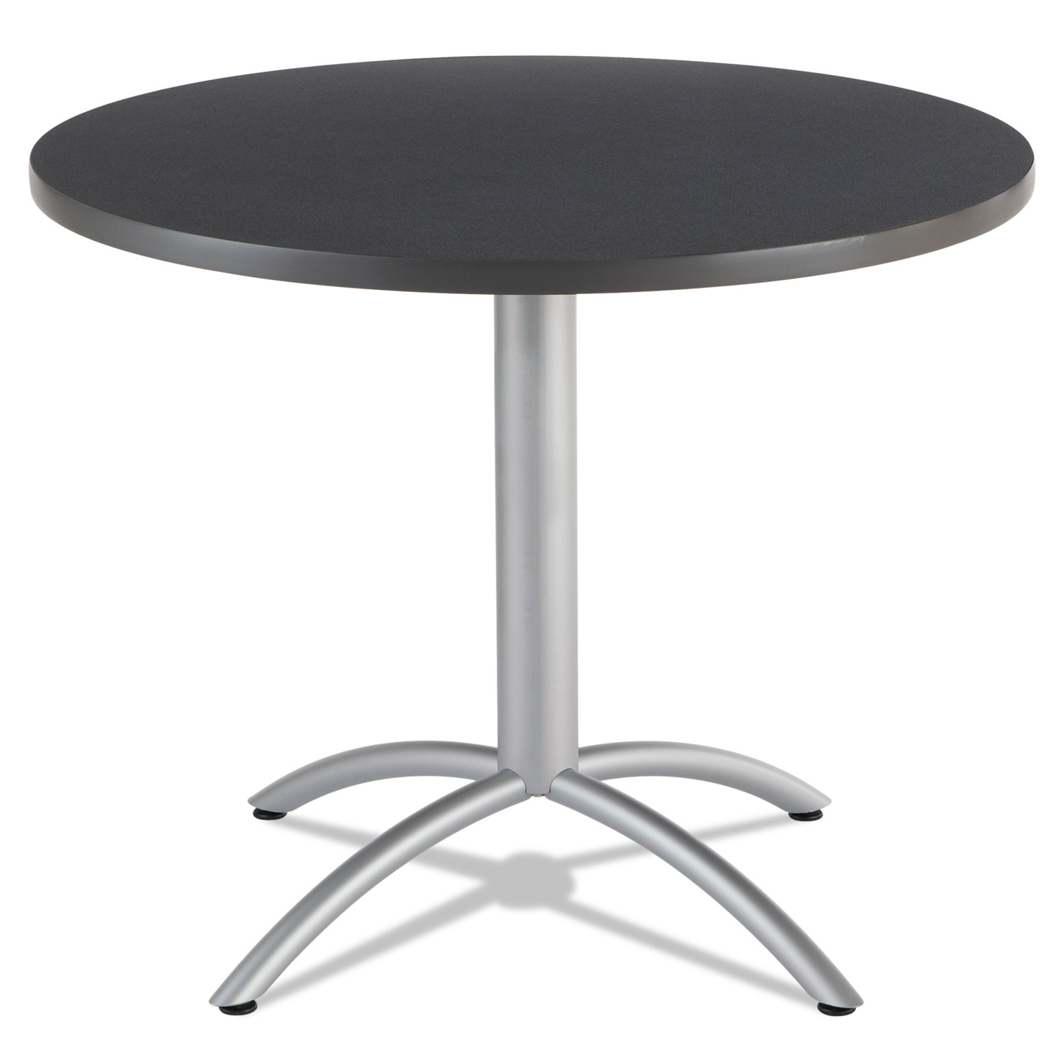 Inspire conversation and collaboration with tables that bring people together. Wear-resistant 1-1/8" thick melamine top resists spills, warping, hot/cold temperatures, and features a vinyl T-mold edge. Powder-coated steel arched base is strong, and adjustable feet compensate for uneven flooring. Caf Height (30" high) Round. Top Color: Graphite Granite; Color Family: Black; Base Color: Silver; Top Shape: Round.