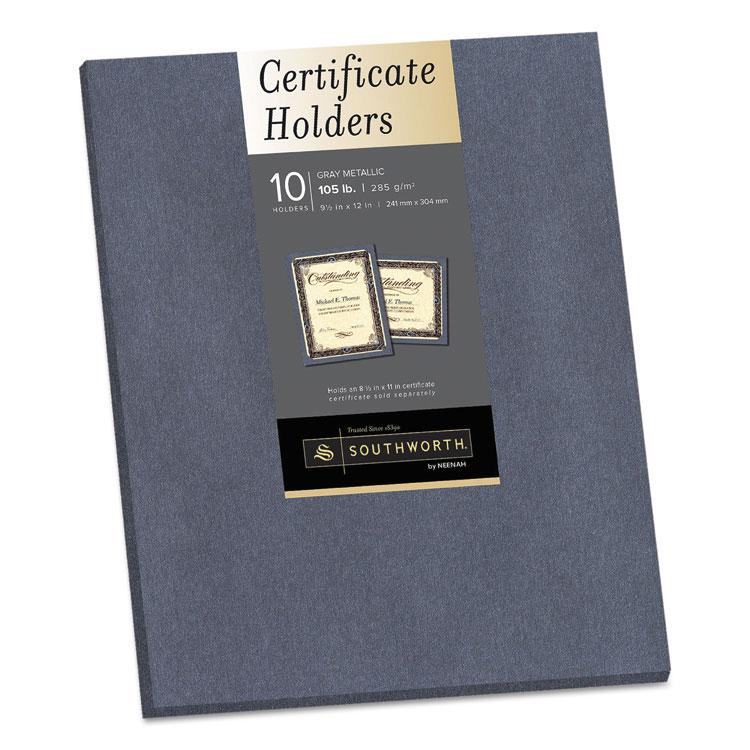 Life Is Noteworthy. Present and display paper awards with these Southworth Certificate Holders. The 105-pound paper weight cardstock provides a stable background for your paper award, and the curved die-cut corners hold the certificate securely in place. Lets you hand out awards to multiple individuals. Color(s): Gray; Width: 12"; Height: 9.5"; Insert Size: 8.5 x 11.