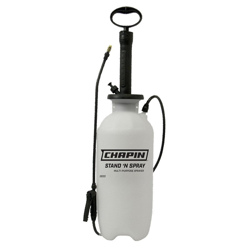 The CHAPIN Stand 'N Spray offers a unique no-bend design with an extended pump and handle. You can pressurize the tank without bending over. It features a translucent poly bottle, funnel-mouth opening with splash guard, SureSpray anti-clog filter, brass nozzle, poly wand and shut-off and pressure relief valve.