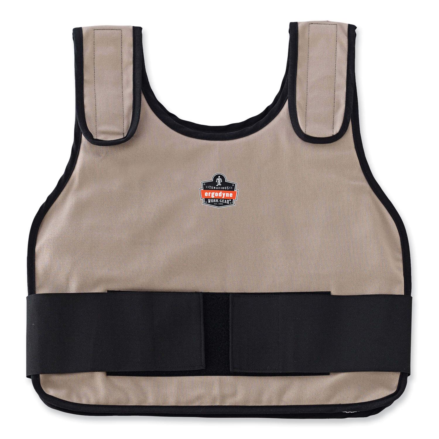 The Chill-Its 6230 Standard Phase Change Cooling Vest helps keep workers cooler, safer and more productive. The phase change cooling material maintains a 64F (18C) temperature for up to four hours when activated. The vest is made of a comfortable cotton blend fabric with adjustable hook-and-loop closures at the shoulders and waist to provide a customized comfortable fit. There are many ways to activate your cooling vest. Simply place the two removable packs in a cooler of ice water for 10 minutes; freezer for 15 minutes; refrigerator for 25 minutes; or near an air conditioner for one to two hours. Then place the recharged cooling packs in the vest pockets for hours of cooling. Apparel Type: Cooling Vest; Material(s): Cotton; Color(s): Khaki; Color Family: Brown.