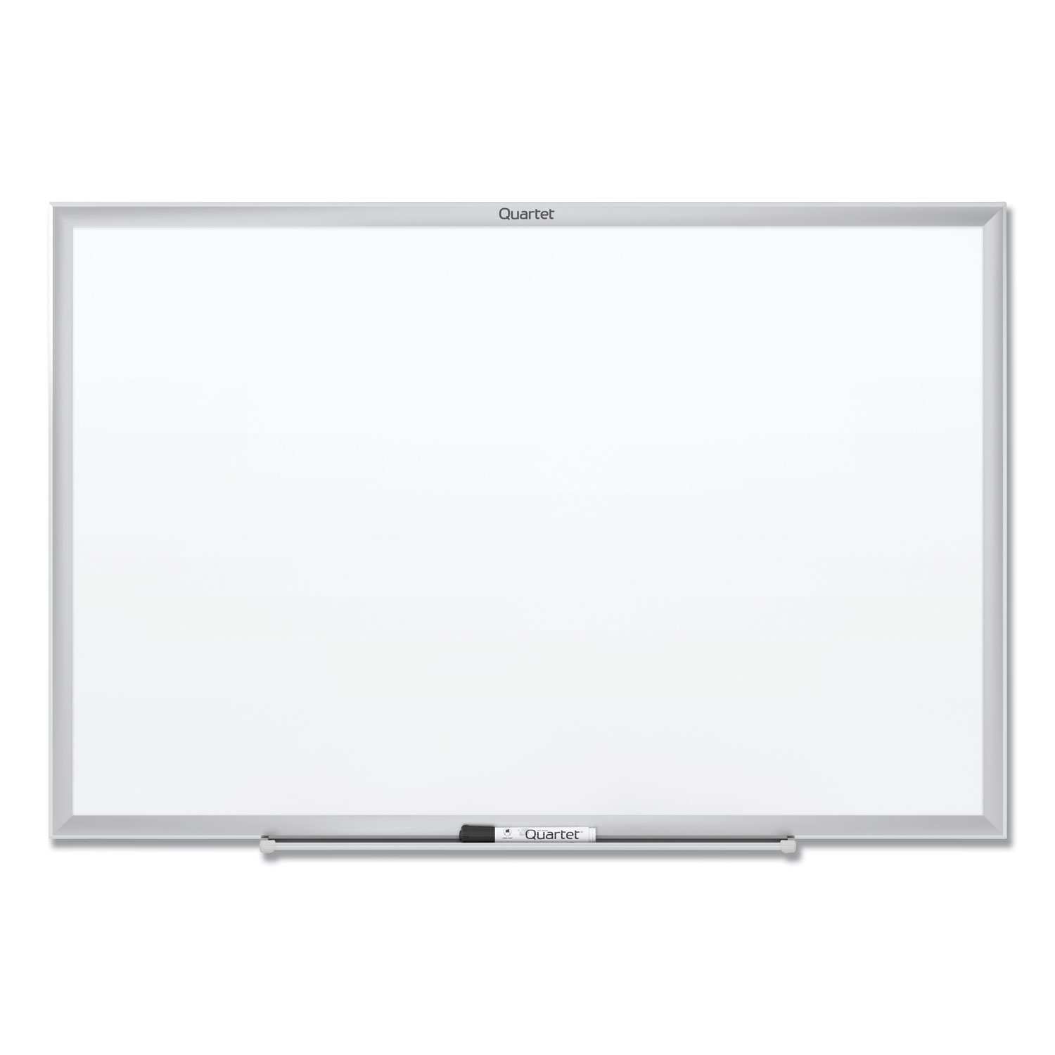 Total Erase dry-erase board with durable surface that resists ghosting and staining and erases cleanly. Best for moderate use in spaces with regular traffic. Frame color complements virtually any dcor. Mount vertically or horizontally with included hardware. Includes marker tray and 1 Quartet dry-erase marker. Silver Aluminum Frame. Board Type: Dry Erase; Board Width: 24"; Board Height: 18"; Surface Material: Total Erase.