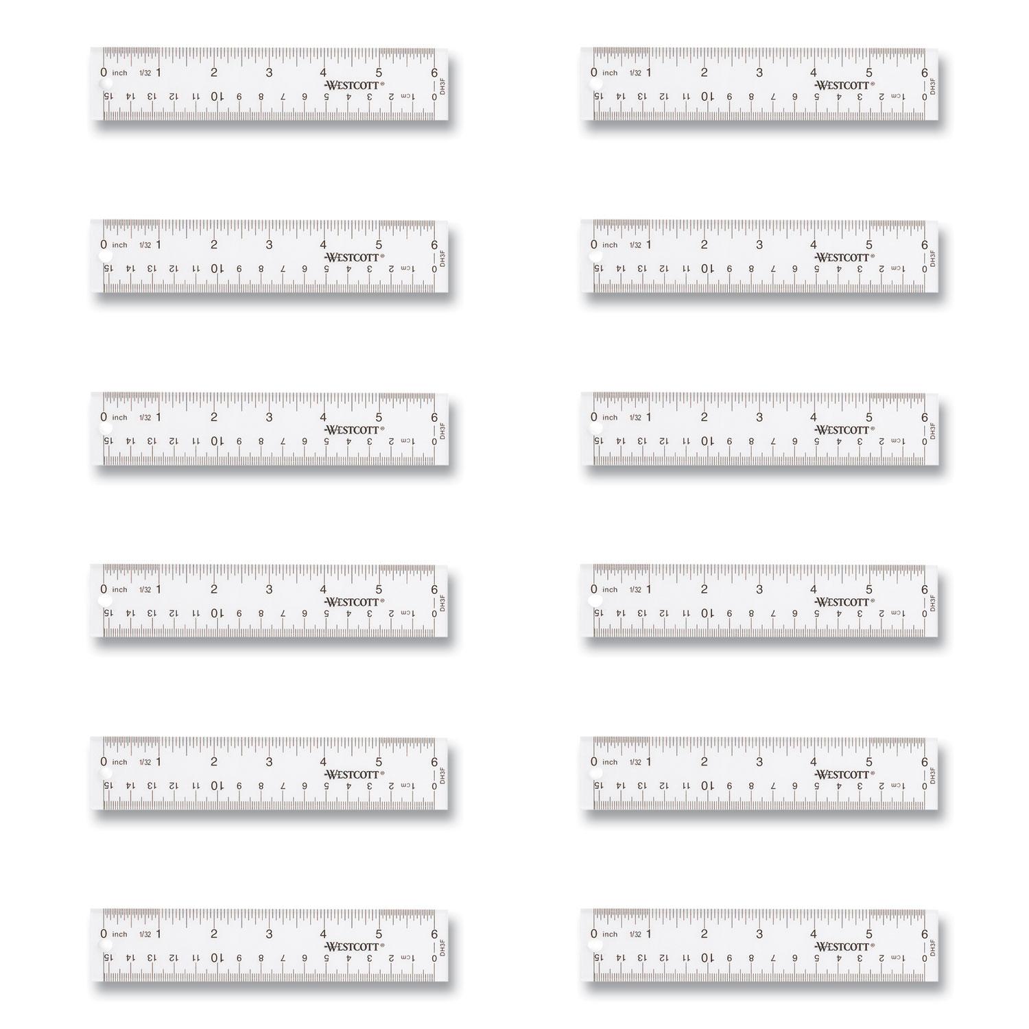Westcott Drafting and Drawing Tools are some of the finest products of their kind for students and professionals. The commitment to meticulous quality and cutting edge innovation in measurement and art materials has earned an unparalleled reputation. Feature-packed ruler is ideal for home, school, office and shop. Precisely scaled in 1/16 on one side and millimeters on the other. Features raised beveled edges to eliminate smearing and extra margins at the ends for clear starts and stops. Plumb lines at ends aid in drawing or checking right angles. Hang-up hole. Ruler Type: Standard/Metric; Length: 6; 15 cm; Standard Scale: 1/16; Metric Scale: Millimeters.