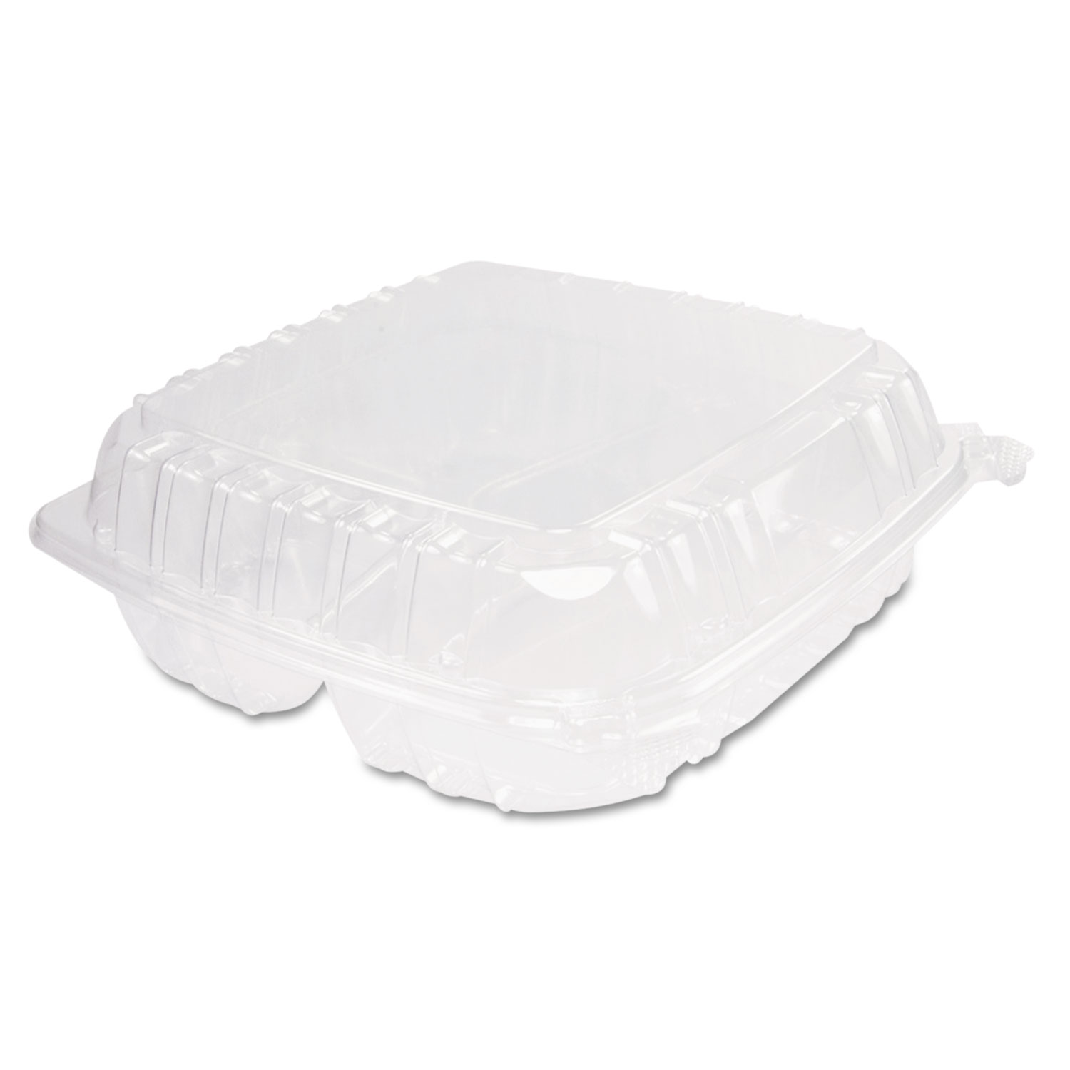 Lock in freshness with ClearSeal. Specially designed perimeter seal maximizes product freshness and minimizes leaks. Bar-locks provide a snap-tight, secure closure. Easy-access gripper tabs simplify opening. Clear plastic makes it easy to see what's inside. Lightweight, crush-resistant and stackable. Food Container Type: Carryout; Material(s): Plastic; Color(s): Clear; Width: 9.5".