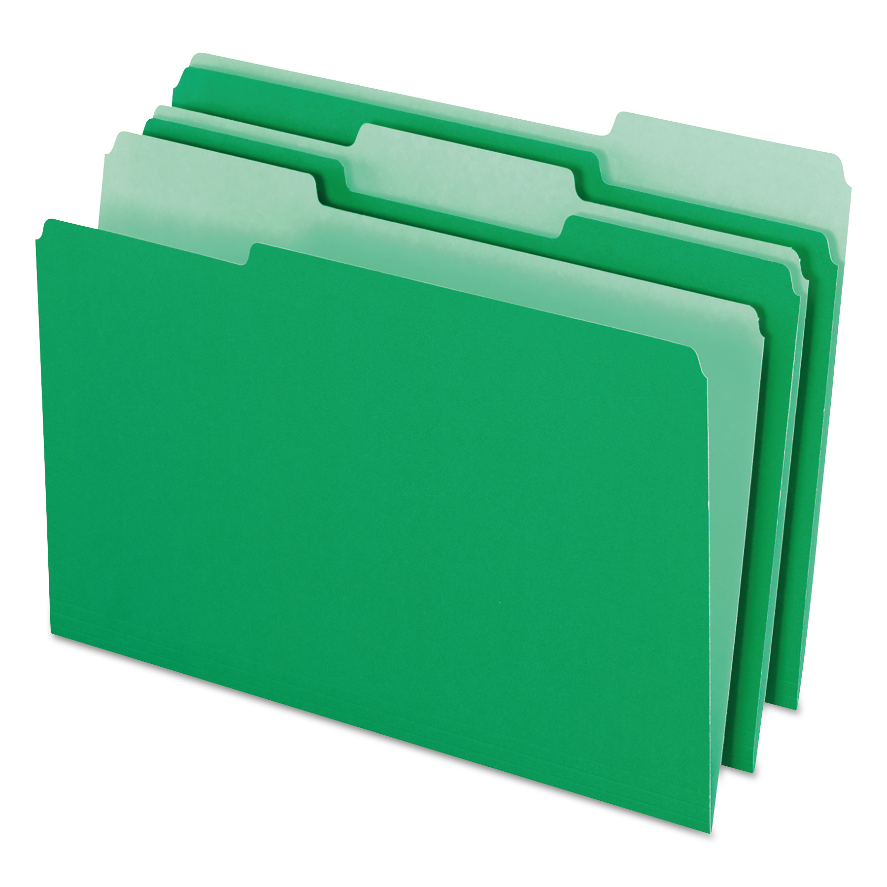Two-tone color reverses to double the number of available colors. Various bright colors make color-coding easy. Interior is a lighter shade than exterior making top tabs easier to see, preventing misfiling. 11 pt. stock. File Folder Size Type: Legal; File Folder Color: Green/Light Green; Color Family: Green; File Folder Material: 11-pt Stock.