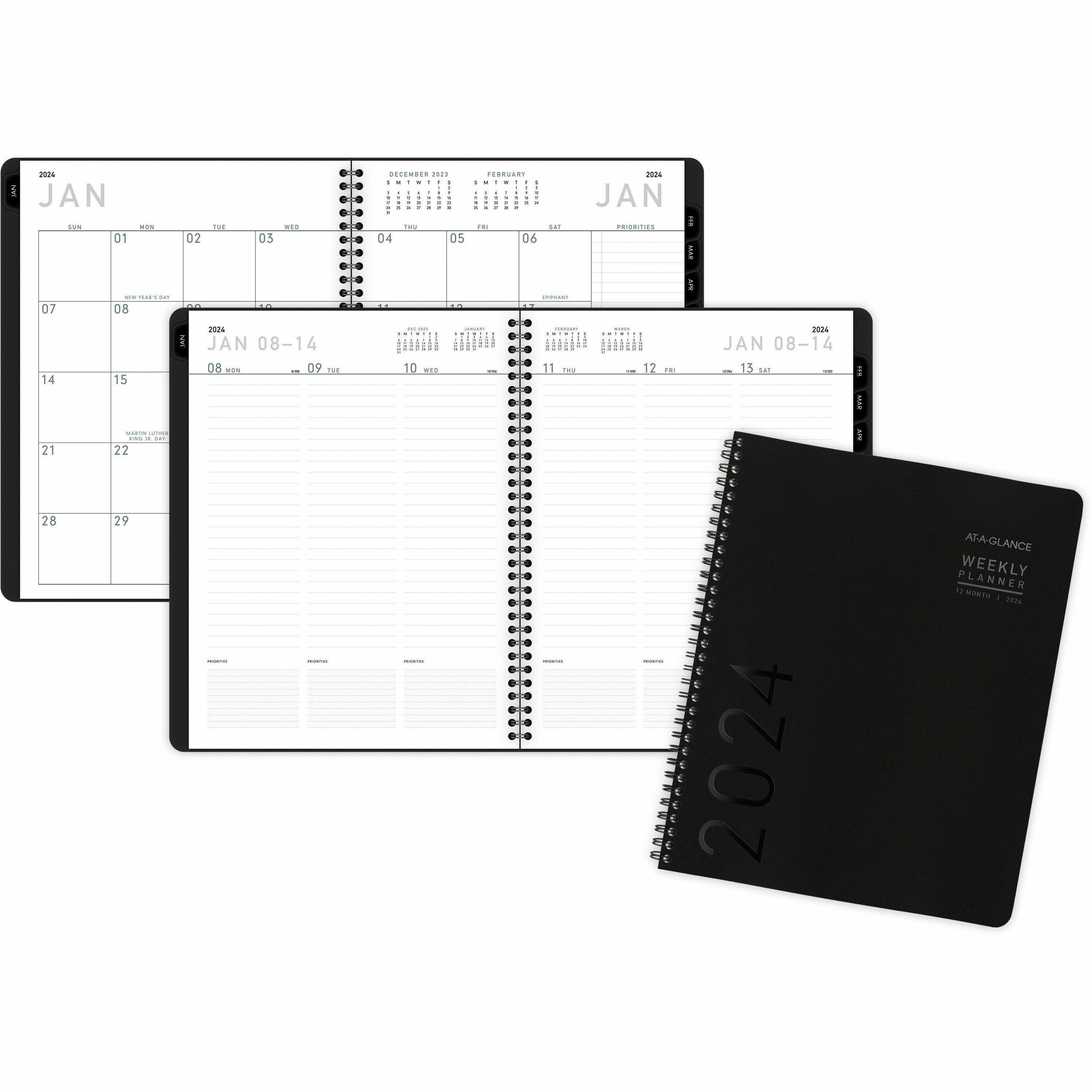 Simplify the way you organize your year with the sleek and professional AT-A-GLANCE Contemporary Lite Weekly Monthly Planners. It includes weekly and monthly planning pages with a modern design for easy planning all year long. Perfect for long-term planning and staying on track, this planner covers a 12-month date range from January to December. High-quality paper features superior ink bleed resistance. One week per two-page spread has ruled planning space for notes and priorities Monday through Friday. Weekends are condensed. One month per two-page spread with unruled daily blocks, a column to list priorities and a tab for easy navigation. Planner has twin-wire binding, black cover and gold accents. Dated/Undated: Dated; Calendar Format: Weekly; Monthly; Page Format: One Week per Two-Page Spread; One Month per Two-Page Spread; Edition Year: 2023.