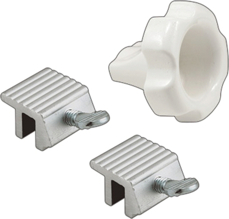 Heavy-duty extruded aluminum lock with single thumbscrew, includes removable round plastic wrench for ease of operation and added torque when tightening or loosening thumbscrew. For installation on metal horizontal sliding windows, securely locks window.