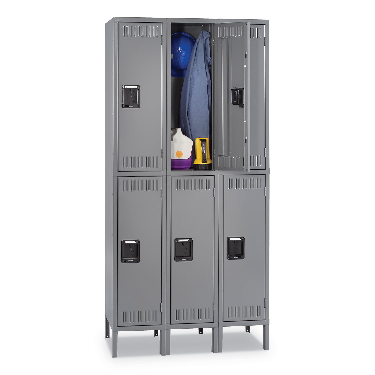 Vertical louvers provide ventilation. Full-length door stiffeners add rigidity and deaden sound when opening/closing. Padlock hasp on each door. Includes number plates for locker identification. Each compartment has hooks for hanging items. Two-point locking system provides security. Triple Stack with LegsSix lockers with tamper-proof hinges and vertical louvers. Color: Medium Gray; Overall Width: 36"; Overall Depth: 18"; Overall Height: 78".