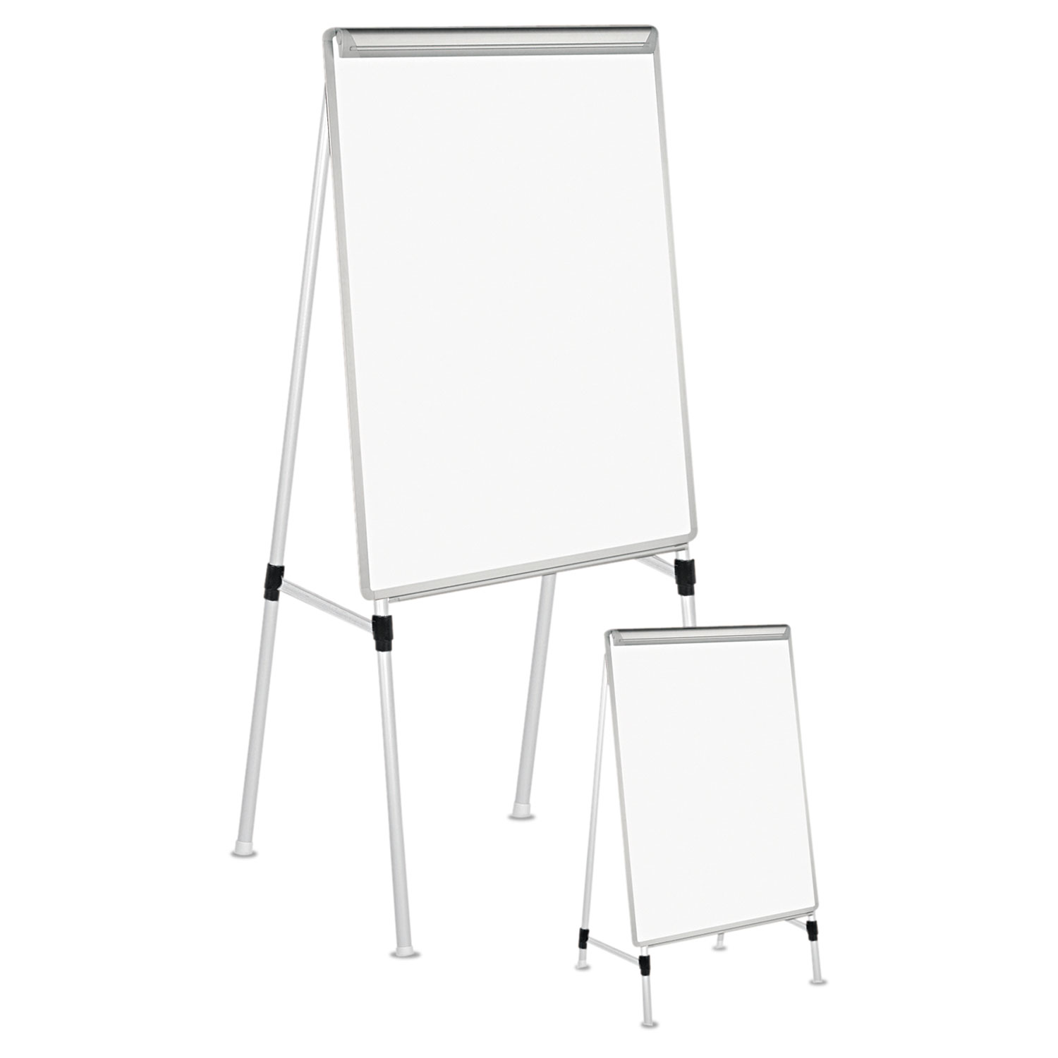 Sturdy easel features an easy-to-clean dry-erase board with a useful no-pinch pad retainer, making it ideal for writing and presenting. Overall height is adjustable, allowing you to use it as a tabletop or floor stand. Appealing frame fits into any environment. Four-leg design ensures stability. Easel Type: Dry Erase Easel Board; Minimum Easel Height: 42"; Maximum Easel Height: 67"; Material(s): Aluminum/Melamine.