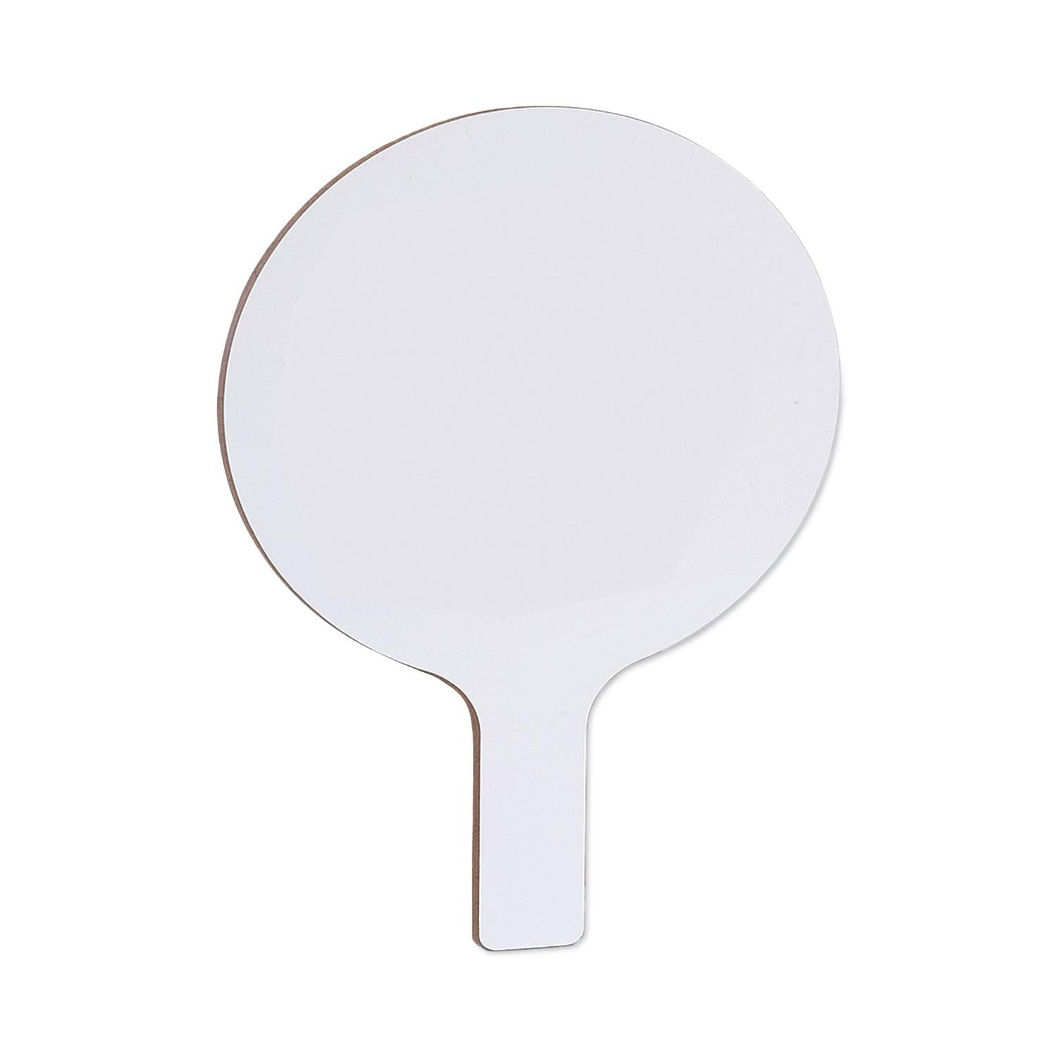 Make everything more fun with dry erase paddles. Quick and quiet whole class participation is made easy with dry erase answer paddles that easily write and wipe clean with an eraser. Great for review sessions, surveys, assessments, and more! Board Type: Dry Erase; Board Width: 9"; Board Height: 5"; Surface Material: Melamine.