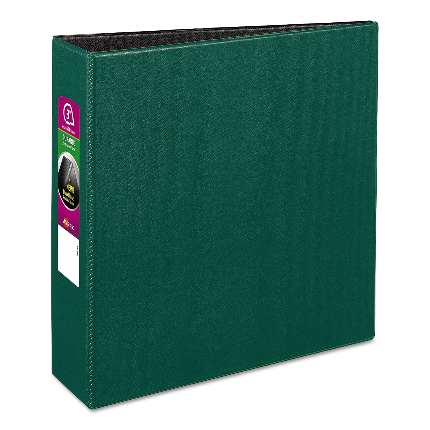 Durable binder features a sturdy construction that's ideal for frequent referencing. The DuraHinge design is stronger, lasts longer and resists tearing, and the DuraEdge feature makes the sides and top more pliable, providing greater split resistance. Deeply textured film offers a smoother finish and features a linen pattern for a high-quality look and feel. The binder features wider front and back panels to fully cover standard dividers and sheet protectors. Slant rings have a higher page capacity when compared to the same size round rings. Pages lie flat with back-mounted rings. Two interior pockets provide plenty of room to store both punched and unpunched paperwork. Binder Type: Ring; Binder Style: Non-View; Binder Size Capacity: 3"; Binder Sheet Capacity: 600.