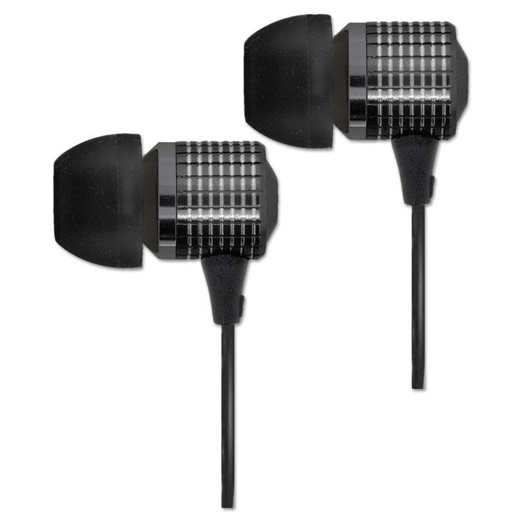 Lightweight, metallic earbuds are easy to use. Earbuds feature great, high quality stereo sound. A microphone allows for an easy switch from music to speech. Comfortable, in-ear fit for long-term use.