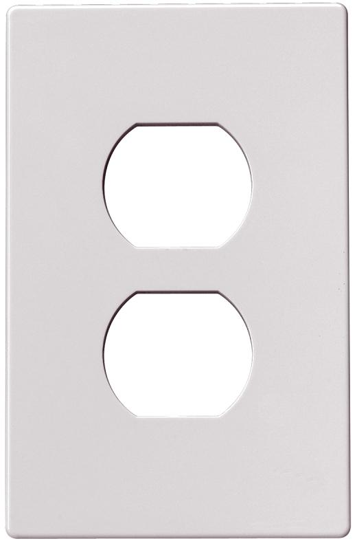Molded from non-flammable Polycarbonate. Virtually unbreakable, with high-structural rigidity, long-term form retention and excellent impact and abrasion resistance. Screwless mid-size duplex receptacle plate, clearly marked top edges, clip easily into place with gentle pressure. Mid-sized to cover wall imperfections and large wallboard openings. Mid-size - 4-7/8 in x 3-1/8 in.