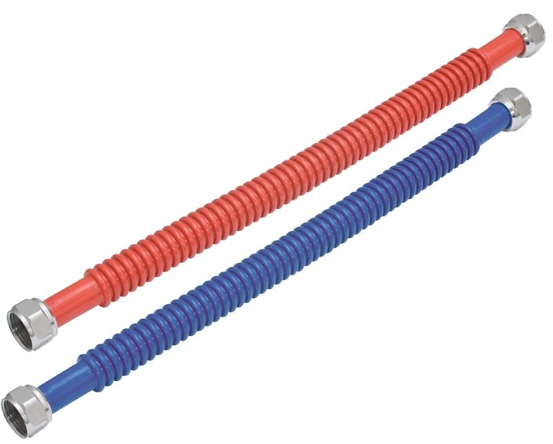 Red and blue epoxy coated connectors with nickel plated brass nuts and nitrile rubber sealing washers. Complies with no-lead laws. 3/4 in FIP x 3/4 in FIP.