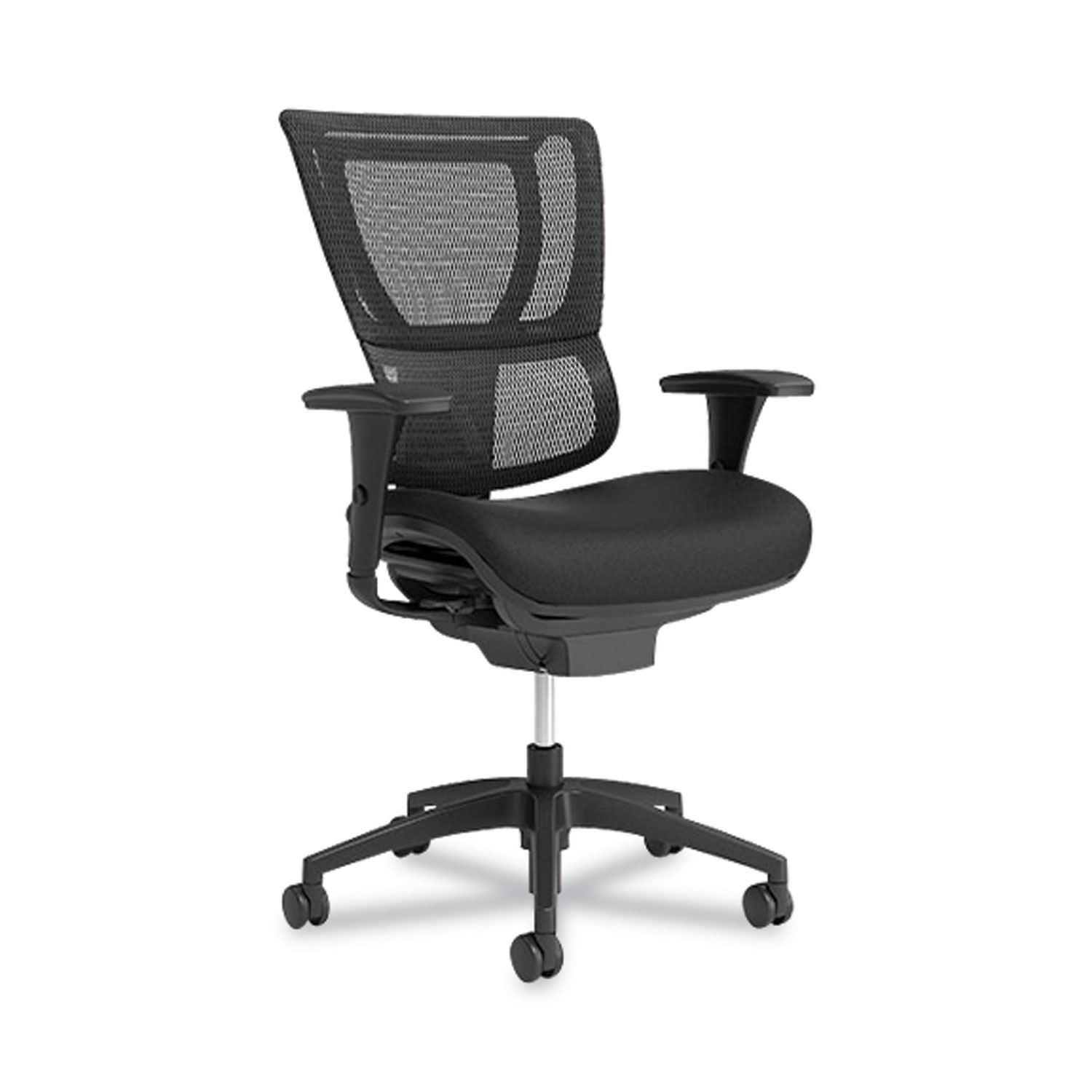 Create a custom seating option for long workdays with this task chair. The adjustable design lets you change the seat height to help improve posture and relieve leg and back stress, while the integrated tilt-tension knob maximizes chair flexibility to provide a comfortable seating spot for a wide range of users. Raise, lower, and slide the armrests to find your optimal arm position. The three-way tilt-lock lever keeps your seat's back in the correct place for your personal comfort, and the versatile seat depth adjusts to four unique positions to assist with relieving thigh pressure. Boasting a breathable construction, this FlexFit 1500TF black mesh and fabric task chair makes a great addition to your office space. Recommended Application Area(s): General Office & Task; Seat Color: Black; Back Color: Black; Color Family: Black.