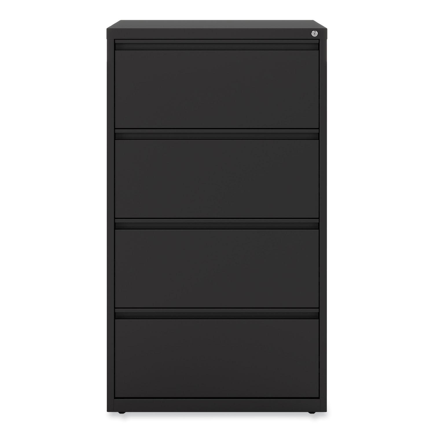 Drawers with side-to-side hang rails to accommodate letter/legal hanging files. Full drawer extension on steel ball bearing telescoping slide suspension. Stylish full-width radius edge recessed pulls. Anti-tipping interlock system allows only one drawer to open at a time. Single key core removable lock with two keys. Four-Drawer. Color: Black; Color Family: Black; Overall Width: 30"; Overall Depth: 18".