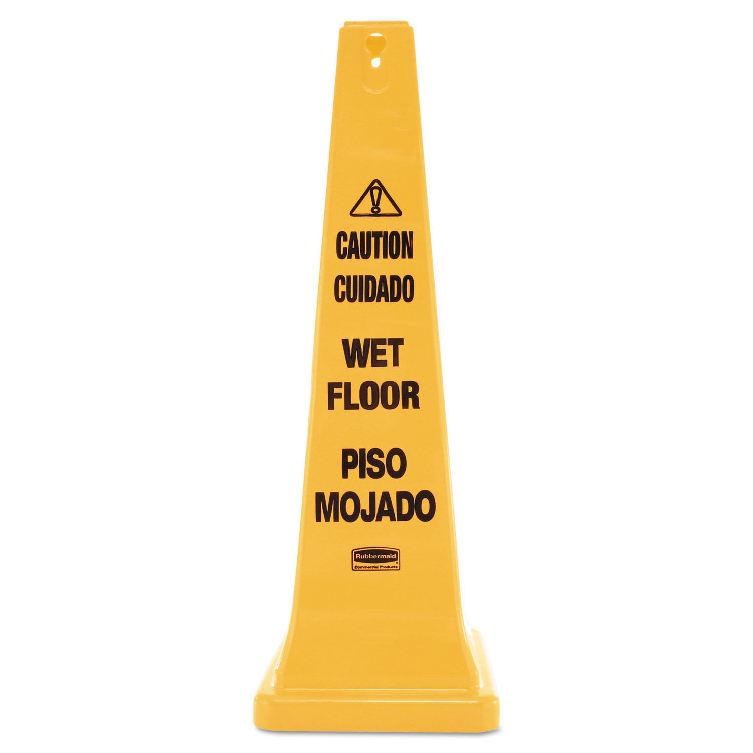 Alert co-workers and visitors alike to proceed carefully. Message is printed in English and Spanish on all four sides of bright yellow cone. Can be read from 40 ft. away. Stackable for easy transport and storage. With Keyhole Openings. Depicted Text: CautionWet Floor; CuidadoPiso Mojado; Width: 12.25"; Depth: 12.25"; Height: 36".