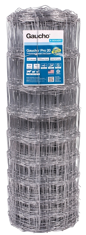 Combining the characteristics of flexible hinge joint field fence with professional strength high-tensile steel wire is the hallmark of high-tensile 12.5 g/10.5 g Gaucho pro professional strength field fence. Its strength means it installs faster, with fewer posts and it retains its shape with less ongoing maintenance concerns compared to low carbon fencing. To deter small animals, our field fence products feature gradual openings at the bottom of the fence, our fence design chart demonstrates the gradual openings for each fence design. With a breaking load of 1,030 lb, there are Gaucho Pro 12.5 g/10.5 g field fence products for various farm and livestock applications including cattle, sheep, goat, swine and equine.