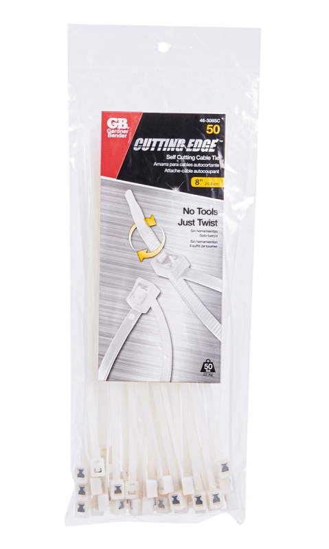Save time and frustration using the latest innovation from Gardner Bender; the self-cutting cable tie. Easy to use; simply lock-and-twist to finish the job, with no need for an additional cutting tool! Unlike other "twist" ties our patented design doesn't require a reduction in the strength and durability of the cable tie material or multiple rotations to achieve a break in the tie. Instead, a small cutting blade designed into the head of each tie ensures a tight lock and quick, clean cut, improving the appearance of the end result and virtually eliminating residual jagged edges which can bite into bare skin.