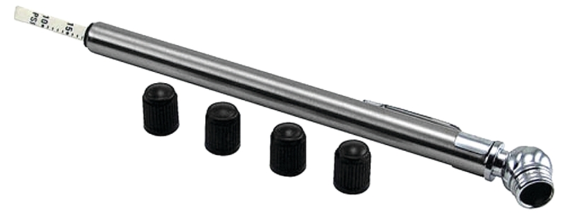 Stainless steel pencil tire gauge designed to check tire pressure of car tires, SUV and truck tires and tractor tires. Four-sided indicator bar. 10 to 50 psi. 4 bonus black plastic valve caps.