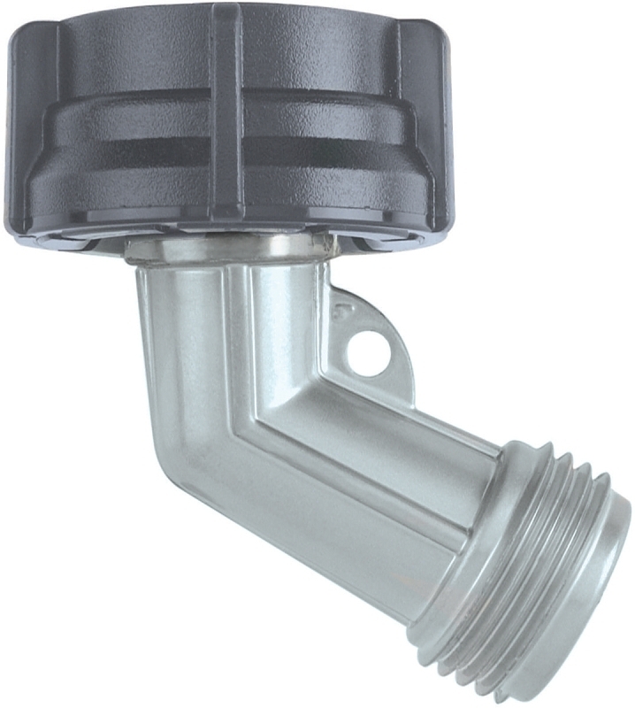 Attaches to faucet. Angles hose or accessories away from hose bib. Nickel-plated zinc casting construction.