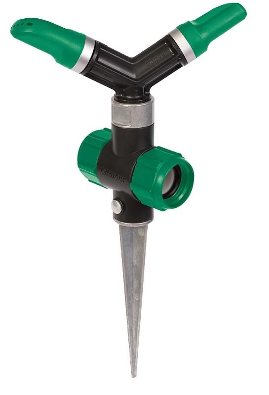 The Gilmour adjustable whirling sprinkler with spike base is ideal for gentle, rain-like watering of delicate flowers, plants and seedlings. Its continuous whirling motion provides full circular coverage while reducing water pooling and adjustable tips allow you to direct the spray lower to the ground, reducing water waste due to evaporation or wind. An outlet valve on the base allows you to connect multiple sprinklers and a durable metal spike provides stability in softer soil and on uneven ground.