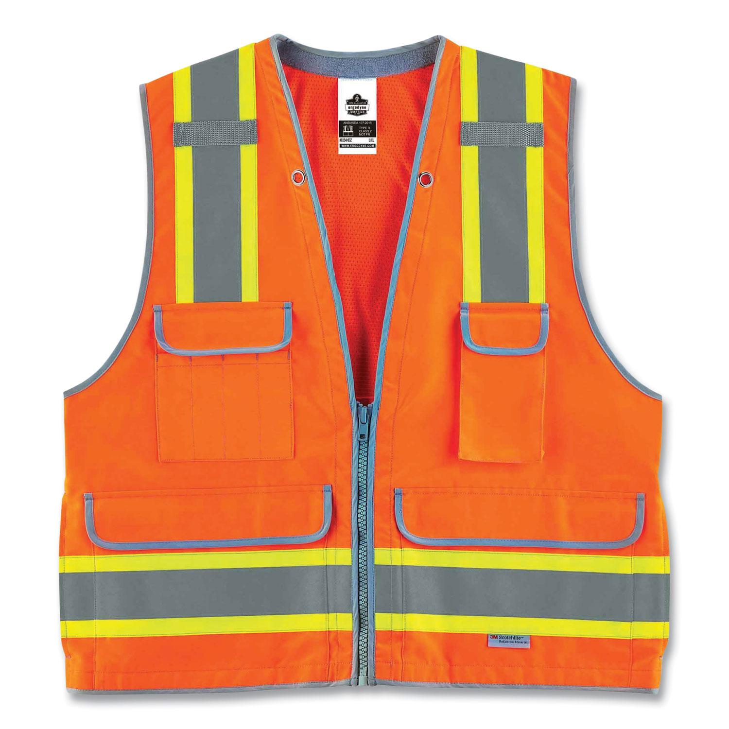 Class 2 Heavy-Duty Surveyors Vest offers serious visibility for serious professionals. Rugged materials and storage galore, this is your new favorite vest. Heavy-duty #10 zipper closure. 2" ANSI-compliant 3M Scotchlite Reflective. Reflective set on 3.5" contrasting background. Four outside pockets and one large zippered rear document/tablet pocket. Dual radio mic tabs. Apparel Type: Safety Vest; Material(s): Polyester; Color(s): Orange; Color Family: Orange.