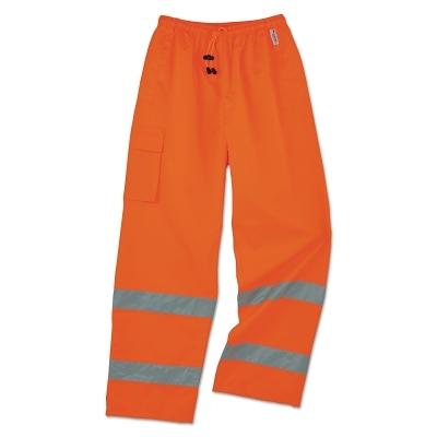 The GloWear 8915 Hi-Vis Rain Pants offer waterproof, breathable protection against wet conditions. A comfortable elastic waistband means these waterproof work pants can be worn alone or over a base layer. The pant legs have zip openings to easily fit over boots. These work rain pants are built for demanding conditions with durable 300D poly oxford material and a breathable polyurethane (PU) coating that lets moisture escape while sealing out the rain to keep workers cool and comfortable. The ANSI compliant high visibility polyester fabric and 3M Scotchlite 2" reflective tape keeps workers highly visible at night or in low light conditions. These hi-vis waterproof pants meet ANSI Supplemental Class E Standards. Made for the industrial workplace and workers in low-light environments, flagging crews, utility crews, road construction, railway workers and any others working in the rain. Apparel Type: Rain Pants; Material(s): Polyester; Color(s): Orange; Color Family: Orange.