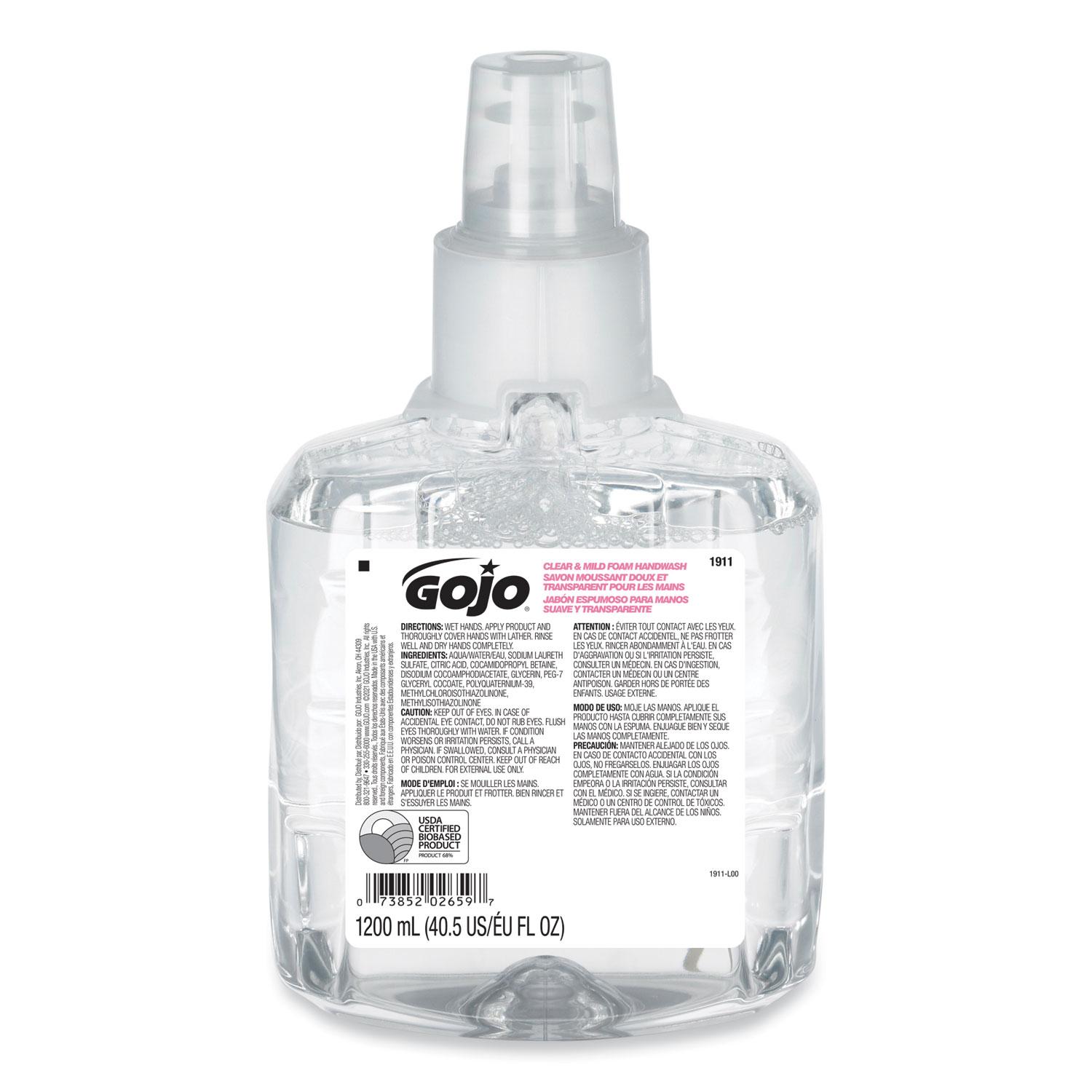 Gojo LTX-12 Clear Mild Foam Handwash Refill - 40.6 fl oz (1200 mL) - Hand, Skin - Clear - Fragrance-free, Dye-free, Rich Lather, Eco-friendly - 2 / Carton| Refill of spa-inspired, foam handwash is designed for GOJO LTX-12 Dispensers and delivers luxurious foam lather in a fragrance-free and dye-free formulation that is enriched with moisturizers and skin conditioners. USDA certified, bio-based, mild formulation is also EcoLogo certified so foam hand soap delights users while supporting a healthy environment. Controlled-collapse GOJO refill holds its shape as it empties for a more attractive appearance. Sanitary-sealed refill is made of durable, recyclable PET material, using 30 percent less plastic than rigid HDPE bottles.Refill of spa-inspired, foam handwash is designed for GOJO LTX-12 Dispensers and delivers luxurious foam lather in a fragrance-free and dye-free formulation that is enriched with moisturizers and skin conditioners. USDA certified, bio-based, mild formulation is also EcoLogo certified so foam hand soap delights users while supporting a healthy environment. Controlled-collapse GOJO refill holds its shape as it empties for a more attractive appearance. Sanitary-sealed refill is made of durable, recyclable PET material, using 30 percent less plastic than rigid HDPE bottles.