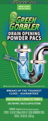 There are a million reasons to sing in the shower, but a clogged shower drain isn't one of them. Break down tangled hair and soap scum with Green Gobbler's drain opening pacs. Our perfectly pre-measured packets will slay the mightiest bathroom or kitchen clogs. Just pour, wait and rinse. Our drain opening pacs will leave you singing "livin' la vida loca." Green Gobbler drain opening pacs will clear the toughest clogs, guaranteed. Each package comes with three pre-measured powder packets. Pour one packet down your bathroom or kitchen drain to break down hair, paper, soap scum, feminine products, sludge and cigarette butts quickly.