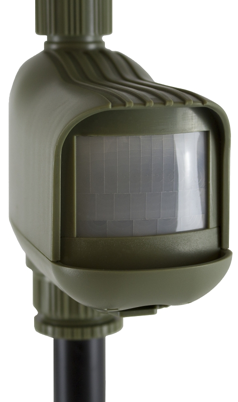 Infrared sensor detects animal heat and movement within a range of up to 100 ft