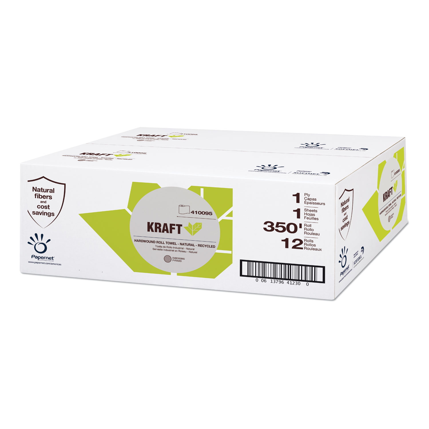 A unique construction allows plies of paper to be bonded and embossed together with glue for a softer "at-home" look and feel. The technology used to make these products limits separation of plies and tissue tears for a more pleasant experience. KraftPyramid embossing. Towel/Wipe Type: Hardwound Roll Towel; Application: General Purpose; Material(s): Kraft; Number of Plies: 1.