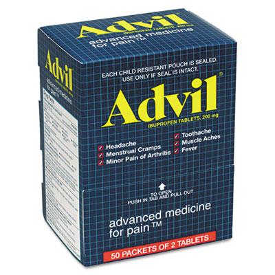 Effective for headaches, backaches, muscle aches, menstrual pain, minor arthritis and other joint pain, body aches and pains from the flu. Packaged for individual use for on the go or to replenish first aid stations and kits. Description: Ibuprofen Tablets, 2/Pack, 50 Packs/Box; For Use With: First Aid Stations/Kits; Individual Use.