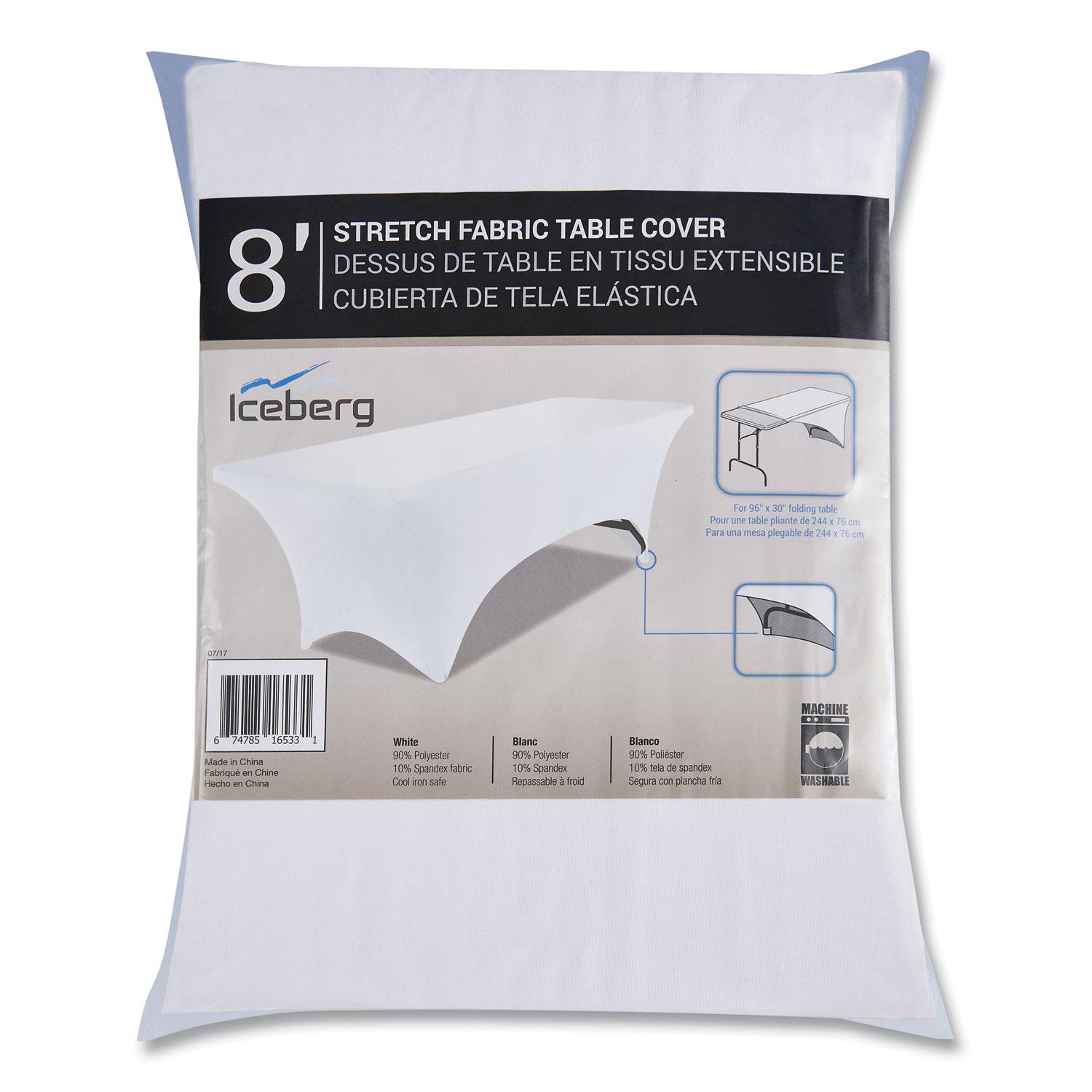 Easily transform resin- or laminate-wood-top tables into elegant presentation platforms in seconds. Tablecloth fits snug over the table for a tailored fit, and reinforced leg-pockets keep the tablecloth secured to the table while preventing tears and rips. Machine washable and iron safe. Shape: Rectangular; Material(s): 90% Polyester; 10% Spandex; Color(s): White; Width: 30".
