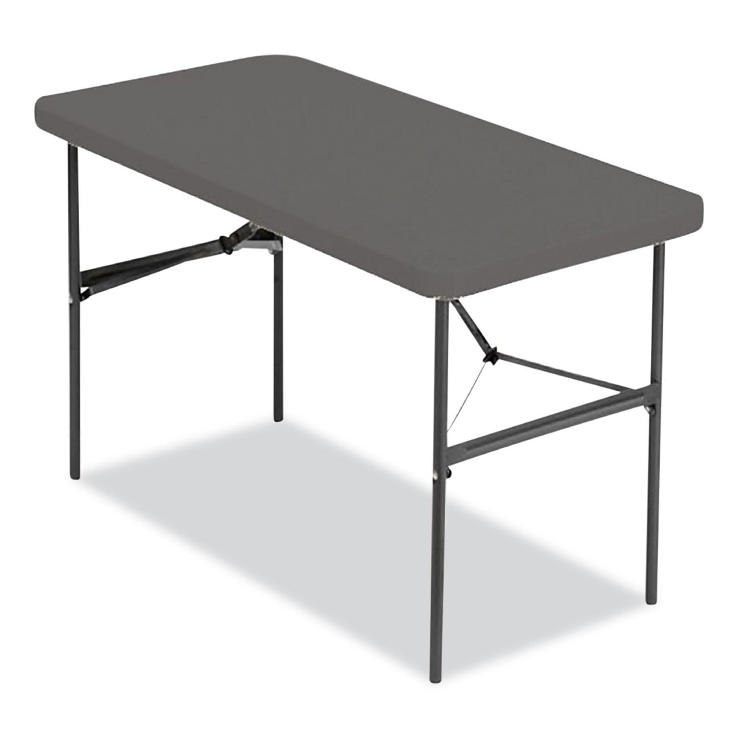 Contemporary in appearance and design, IndestrucTable Commercial Folding Tables are designed for use indoors and out. Easy to set up, take down and transport, these lightweight tables are ideal for foodservice, school and office environments as well as at weddings, banquets and any number of special events. Dent- and scratch-resistant as well as surprisingly easy to clean, the blow-molded high-density polyethylene top features a square edge, so tablecloths can hang straight, ensuring a neat and tidy table-service appearance. Sturdy, powder-coated steel-tubing legs and an all-steel base provide a solid foundation to support anything from heavy merchandise displays to a full holiday feast. Convenient recessed channels for the legs allow the table to fold nearly flat for easy, compact storage. Rubber glides affixed to each leg help protect the finish on hard flooring. Top Color: Charcoal; Color Family: Gray; Base Color: Charcoal; Top Shape: Rectangular.