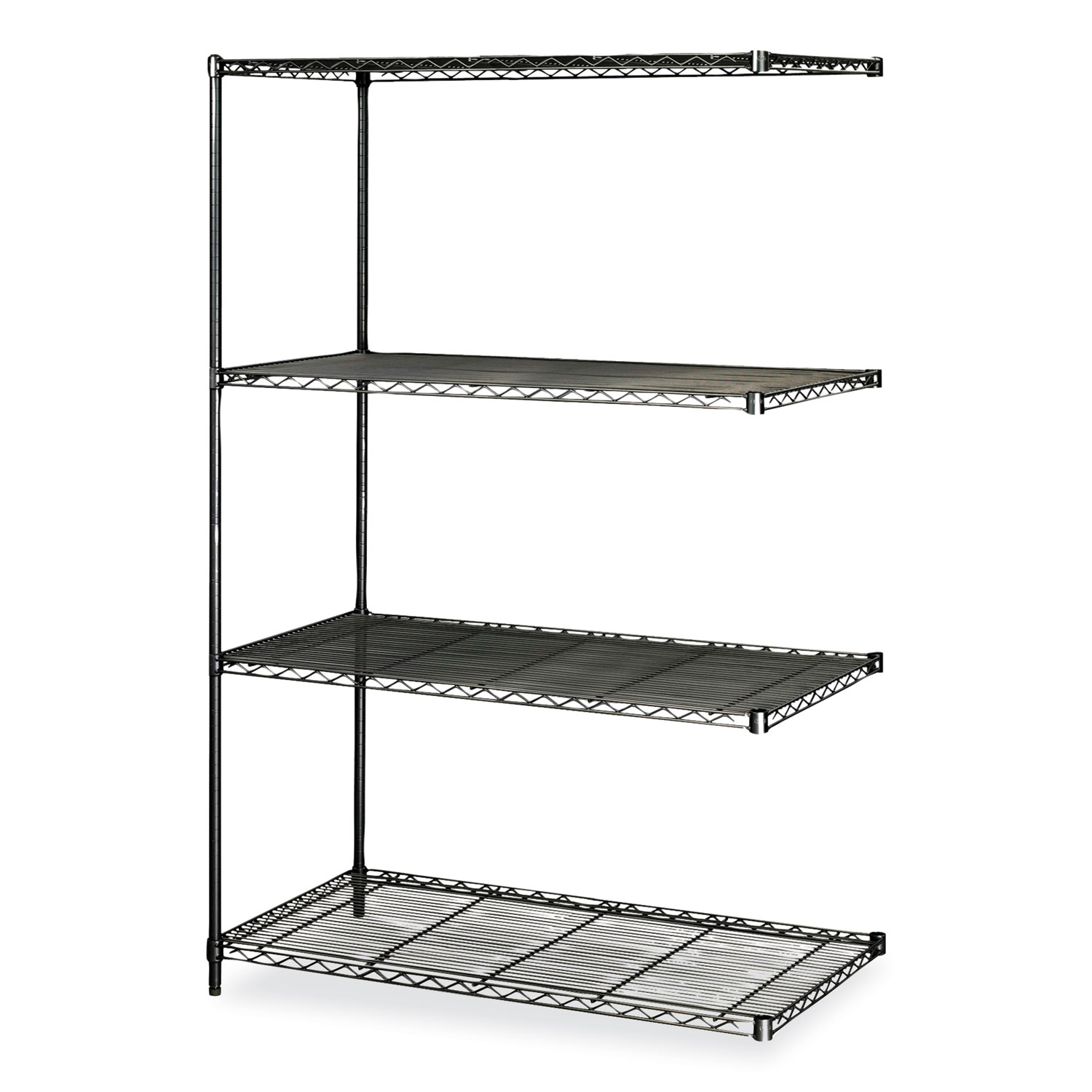 The Industrial Add-On Unit is an extra strength, welded wire construction storage shelf. The open wire shelves are perfect for office storage, promotes air circulation and reduces dust accumulation. The storage shelf is furnished with wire shelves that adjust in 1" increments, and includes four steel shelves, four posts and snap-together clips. Series Name: Safco Industrial Wire Shelving; Shelf Type: Adjustable; Shelf Depth: 24"; Shelf Capacity (Weight): 800 lbs.